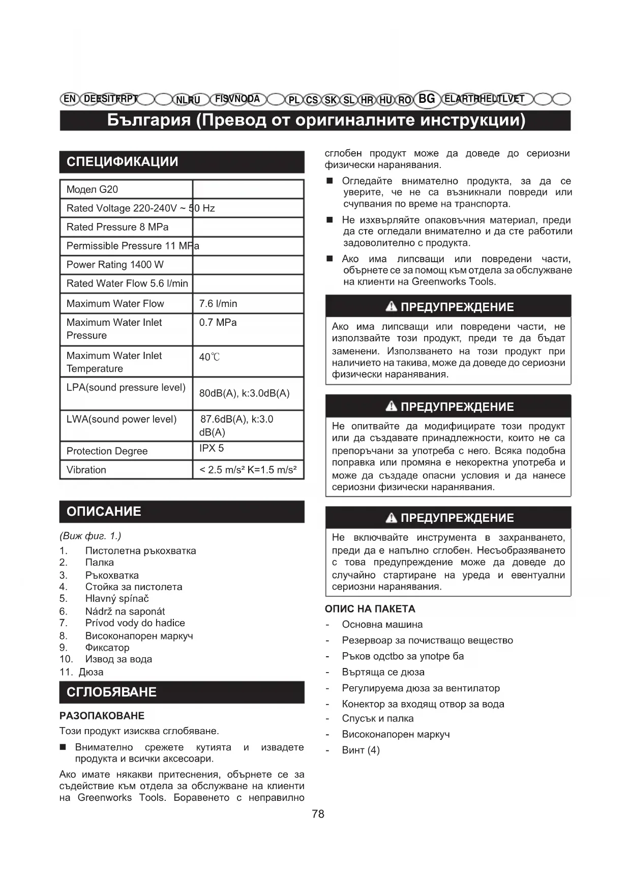 G20 - високонапорен почистващ уред GREENWORKS - Безплатно ръководство за потребителя