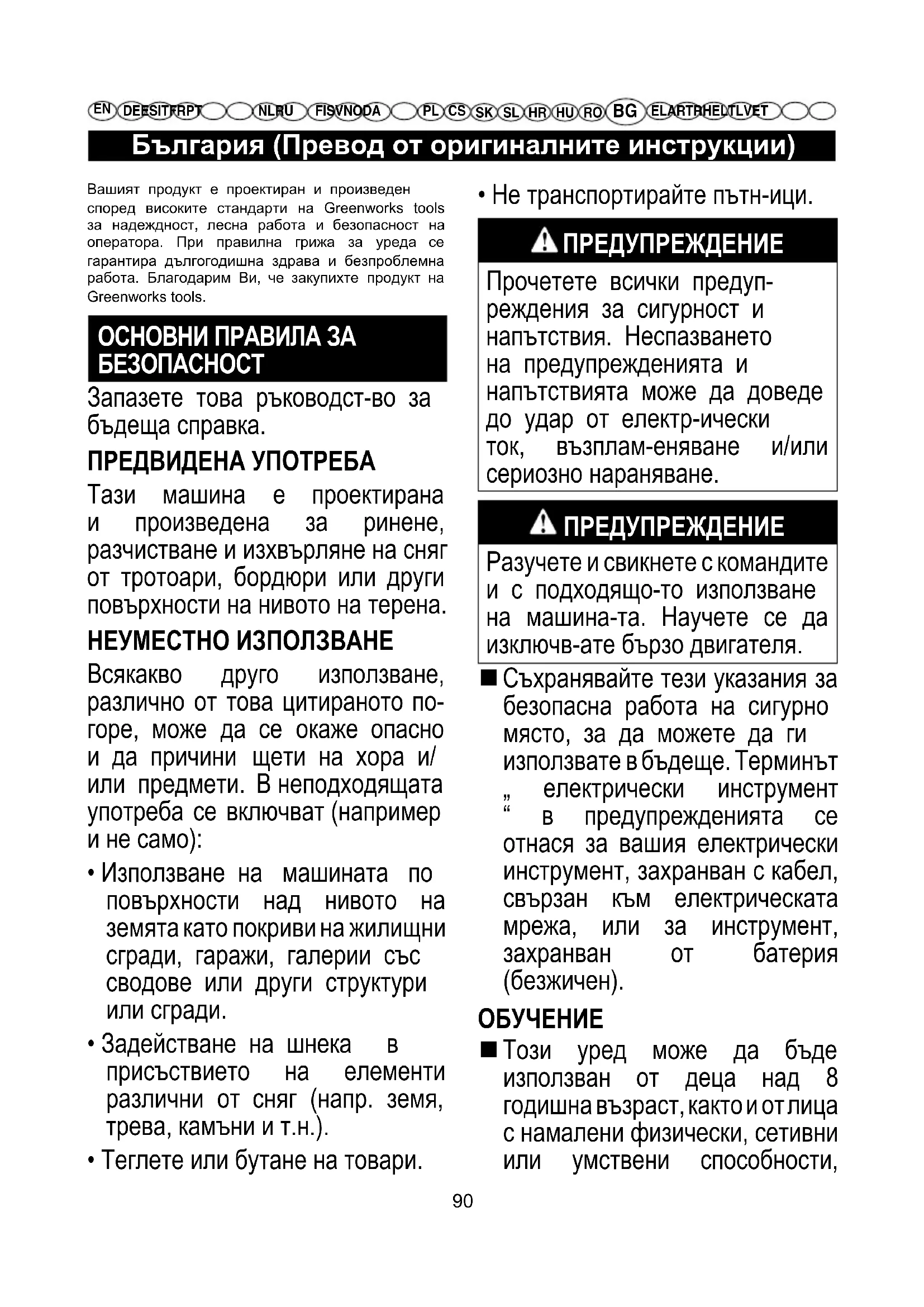 Този уред може да бъде използван от деца над 8 годишна възраст, както и от лица с намалени физически, сетивни или умствени способности, Вашият продукт е проектиран и произведен според високите стандарти на Greenworks tools за надеждност, лесна работа и безопасност на оператора. При правилна грижа за уреда се гарантира дългогодишна здрава и безпроблемна работа. Благодарим Ви, че закупихте продукт на Greenworks tools. ОСНОВНИ ПРАВИЛА ЗА БЕЗОПАСНОСТ Запазете това ръководст-во за бъдеща справка. ПРЕДВИДЕНА УПОТРЕБА Тази машина е проектирана и произведена за ринене, разчистване и изхвърляне на сняг от тротоари, бордюри или други повърхности на нивото на терена. НЕУМЕСТНО ИЗПОЛЗВАНЕ Всякакво друго използване, различно от това цитираното по- горе, може да се окаже опасно и да причини щети на хора и/ или предмети. В неподходящата употреба се включват (например и не само):