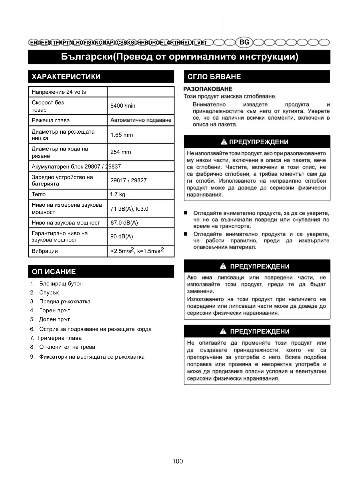 Евентуален контакт с режещата глава на тримера може да доведе до тежки физически наранявания. 101Български(Превод от оригиналните инструкции)