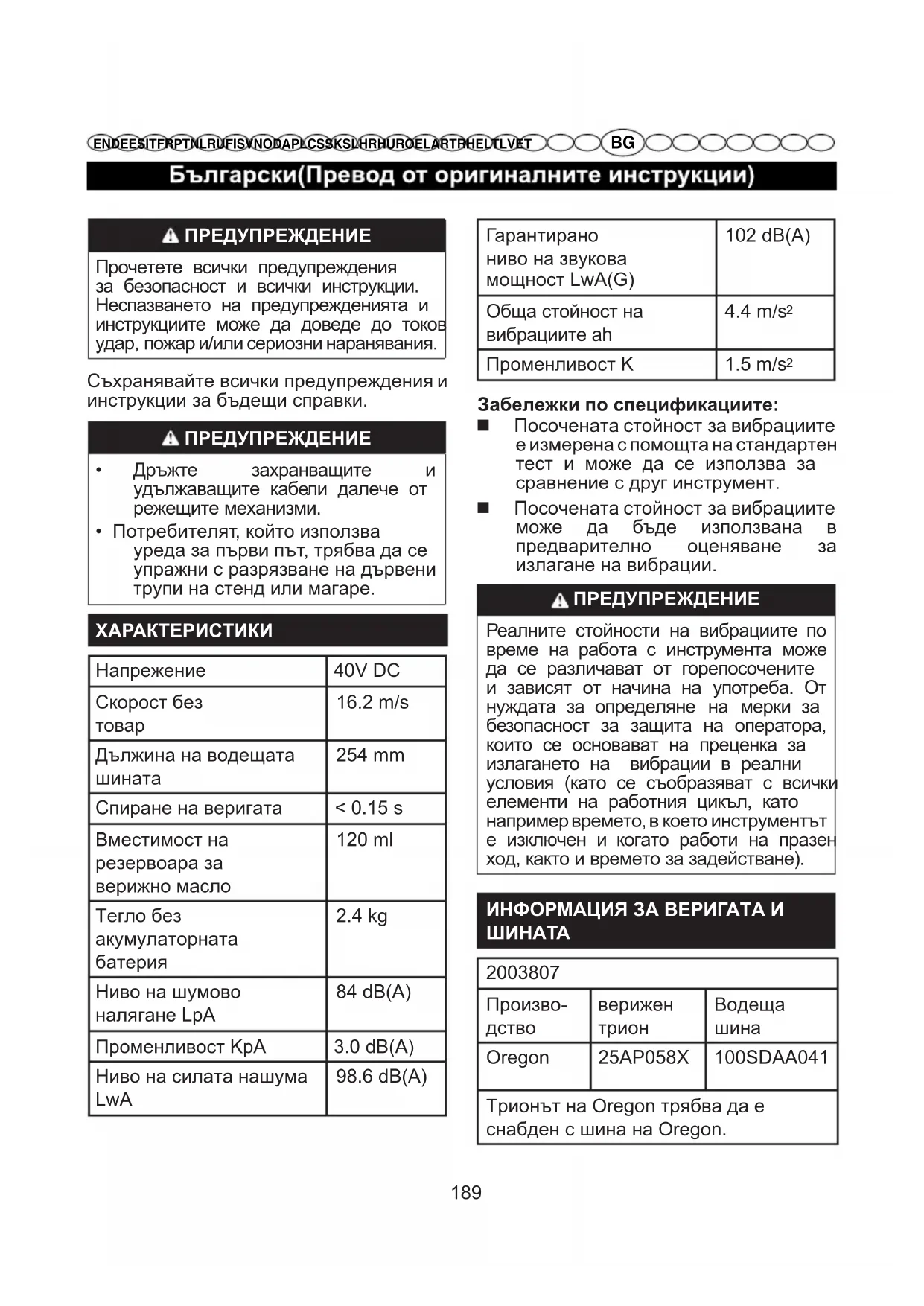 Забележки по спецификациите: Посочената стойност за вибрациите е измерена с помощта на стандартен тест и може да се използва за сравнение с друг инструмент. Посочената стойност за вибрациите може да бъде използвана в предварително оценяване за излагане на вибрации. ПРЕДУПРЕЖДЕНИЕ Реалните стойности на вибрациите по време на работа с инструмента може да се различават от горепосочените и зависят от начина на употреба. От нуждата за определяне на мерки за безопасност за защита на оператора, които се основават на преценка за излагането на вибрации в реални условия (като се съобразяват с всички елементи на работния цикъл, като например времето, в което инструментът е изключен и когато работи на празен ход, както и времето за задействане). ИНФОРМАЦИЯ ЗА ВЕРИГАТА И