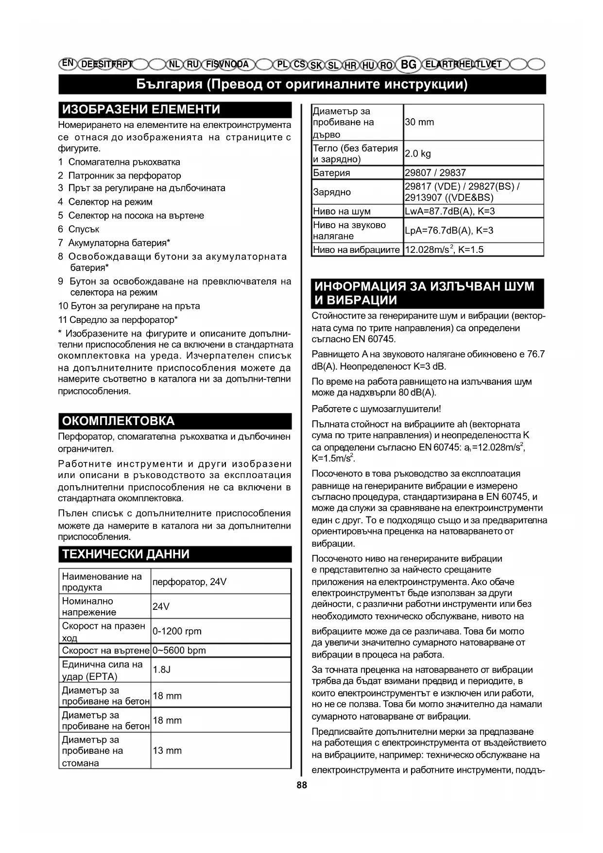 - Изобразените на фигурите и описаните допълни- телни приспособления не са включени в стандартната окомплектовка на уреда. Изчерпателен списък на допълнителните приспособления можете да намерите съответно в каталога ни за допълни-телни приспособления. ОКОМПЛЕКТОВКА Перфоратор, спомагателна ръкохватка и дълбочинен ограничител. Работните инструменти и други изобразени или описани в ръководството за експлоатация допълнителни приспособления не са включени в стандартната окомплектовка. Пълен списък с допълнителните приспособления можете да намерите в каталога ни за допълнителни приспособления. ТЕХНИЧЕСКИ ДАННИ Наименование на