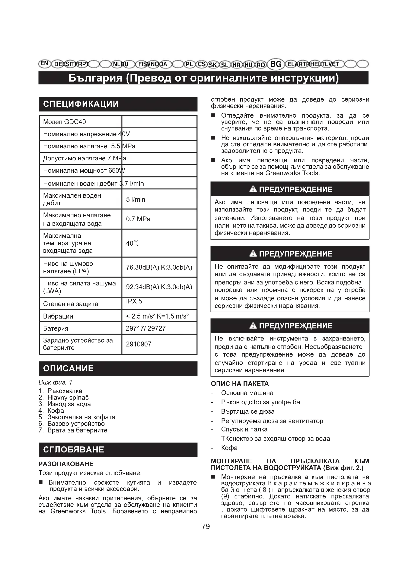 DE ES IT FR PTNL RUFI SV NO DA EL AR TR HE LT LV ET ПРЕДУПРЕЖДЕНИЕ В н и к а к ъ в с л у ч а й н е п о з в о л я в а й те пластмасовите части да влизат в контакт съсспирачни течности, бензин, нефтени п р о д у к ти , п р о н и к в а щ и м а с л а и т. н . Химикалитемогат да повредят, отслабят или унищожатпластмасата, което може да доведе до сериознифизически наранявания. Само частите, които саописани в списъка, са подходящи за ремонт иподмяна от клиента. Всички други части следвада се заменят от оторизиран сервиз.ПОДДРЪЖКА НА ДЮЗИТЕ (Виж фиг. 13.)Ако дюзата е замърсена или задръстена, може да налягането в помпата да се увеличи прекомерно (усеща се пулсиране, докато стискате спусъка). Изключете водоструйката от щепсела. Изключете водоструйката и спрете източника на вода. Дръпнете спусъка, за да освободите налягането. Отделете дюзата от копието.ЗАБЕЛЕЖКА: Никога не насочвайте копието към лицето си. Почистете дюзата от чужди частици, които я задръстват или ограничават, като използвате изправен кламер или инструмент за почистване на дюзи. Използвайки градински маркуч почистете/ промийте наносите в дюзата. Прикачете отново дюзата на копието. Пуснете водното захранване.СЪХРАНЯВАНЕ НА ВОДОСТРУЙКАТА Съхранявайте машината в сухо закрито помещение, където няма опасност от замръзване и климатичните условия няма да я повредят. Винаги, преди да приберете водоструйката за съхранение, изпразвайте водата от пистолета, маркуча и помпата. ЗАБЕЛЕЖКА: Препоръчително е използването на предпазителя за помпата, който ще предотврати повреди в следствие на студ през зимните месеци. Разделно събиране. Този продукт не трябва да се изхвърля заедно с останалите битови отпадъци. Ако вашият продукт на Greenworks Tools има нужда от подмяна или не възнамерявате да го използвате повече, не трябва да го изхвърляте в битовите отпадъци. Отделете продукта за разделно събиране.Разделното събиране на използвани продукти и опаковки позволява материалите да бъдат рециклирани и използвани повторно. Повторното използване на рециклирани материали предотвратява замърсяването на околната среда и намалява потребността от суровини. Batteries Li-ion В края на експлоатационния живот на батериите трябва да ги изхвърлите по екологосъобразен начин. Акумулаторната батерия съдържа материали, които са опасни за вас и околната среда. Тя трябва да се извади от уреда и да се изхвърли разделно в обект, който приема литиево- йонни батерии.83 Ελληνικά (Πρωτότυπες οδηγίες)