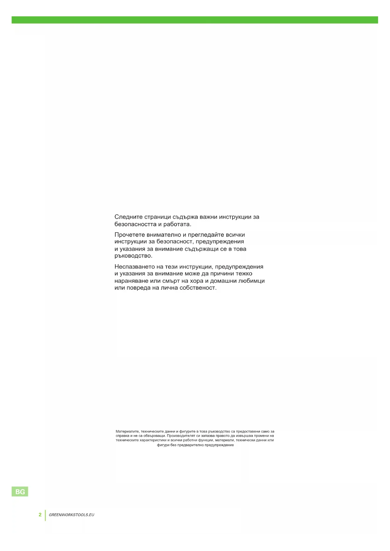 Материалите, техническите данни и фигурите в това ръководство са предоставени само за справка и не са обвързващи. Производителят си запазва правото да извършва промени на техническите характеристики и всички работни функции, материали, технически данни или фигури без предварително предупреждение Следните страници съдържа важни инструкции за безопасността и работата. Прочетете внимателно и прегледайте всички инструкции за безопасност, предупреждения и указания за внимание съдържащи се в това ръководство. Неспазването на тези инструкции, предупреждения и указания за внимание може да причини тежко нараняване или смърт на хора и домашни любимци или повреда на лична собственост.GREENWORKSTOOLS.EU