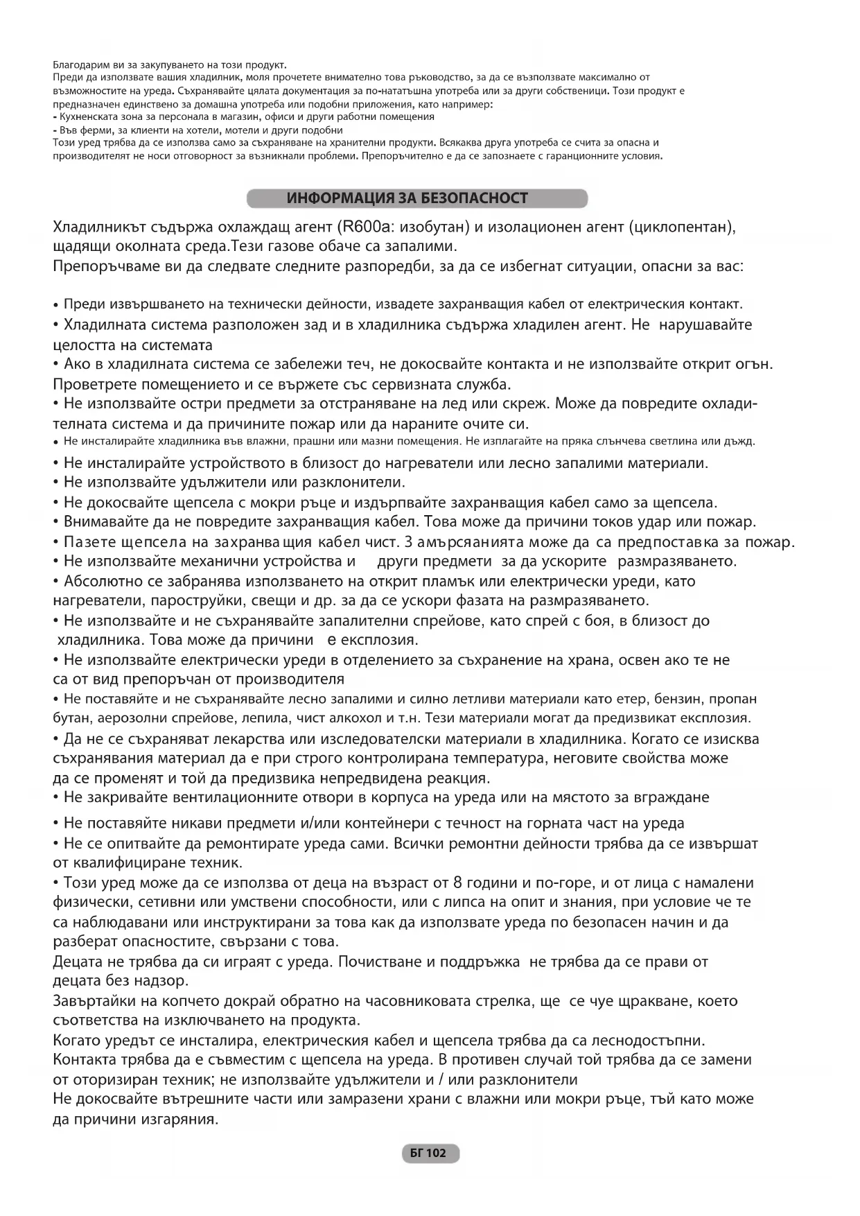 Този уред може да се използва от деца на възраст от 8 години и по-горе, и от лица с намалени физически, сетивни или умствени способности, или с липса на опит и знания, при условие че те са наблюдавани или инструктирани за това как да използвате уреда по безопасен начин и да разберат опасностите, свързани с това. Децата не трябва да си играят с уреда. Почистване и поддръжка не трябва да се прави от децата без надзор. Завъртайки на копчето докрай обратно на часовниковата стрелка, ще се чуе щракване, което съответства на изключването на продукта. Когато уредът се инсталира, електрическия кабел и щепсела трябва да са леснодостъпни. Контакта трябва да е съвместим с щепсела на уреда. В противен случай той трябва да се замени от оторизиран техник; не използвайте удължители и / или разклонители Не докосвайте вътрешните части или замразени храни с влажни или мокри ръце, тъй като може да причини изгаряния. ИНФОРМАЦИЯ ЗА БЕЗОПАСНОСТ БГ 102• Контактът е правилно заземен.