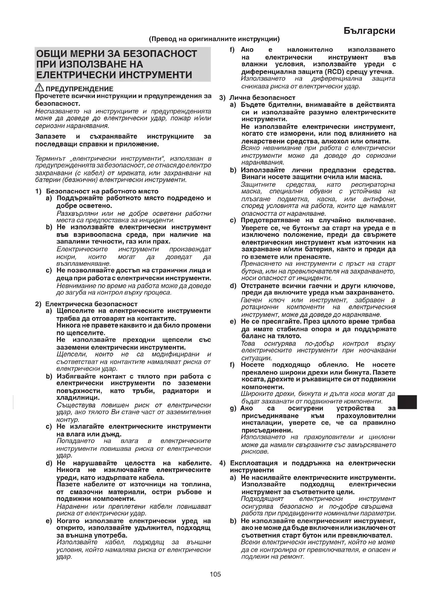 инструменти a) Не насилвайте електрическите инструменти. Използвайте подходящ електрически инструмент за съответните цели. Подходящият електрически инструмент осигурява безопасно и по-добре свършена работа при предвидените номинални параметри. b) Не използвайте електрическият инструмент, ако не може да бъде включен или изключен от съответния старт бутон или превключвател. Всеки електрически инструмент, който не може да се контролира от превключвателя, е опасен и подлежи на ремонт. ОБЩИ МЕРКИ ЗА БЕЗОПАСНОСТ ПРИ ИЗПОЛЗВАНЕ НА ЕЛЕКТРИЧЕСКИ ИНСТРУМЕНТИ ПРЕДУПРЕЖДЕНИЕ Прочетете всички инструкции и предупреждения за безопасност. Неспазването на инструкциите и предупрежденията може да доведе до електрически удар, пожар и/или сериозни наранявания. Запазете и съхранявайте инструкциите за последващи справки и приложение. Терминът „електрически инструменти“, използван в предупрежденията за безопасност, се отнася до електро захранвани (с кабел) от мрежата, или захранвани на батерии (безжични) електрически инструменти.