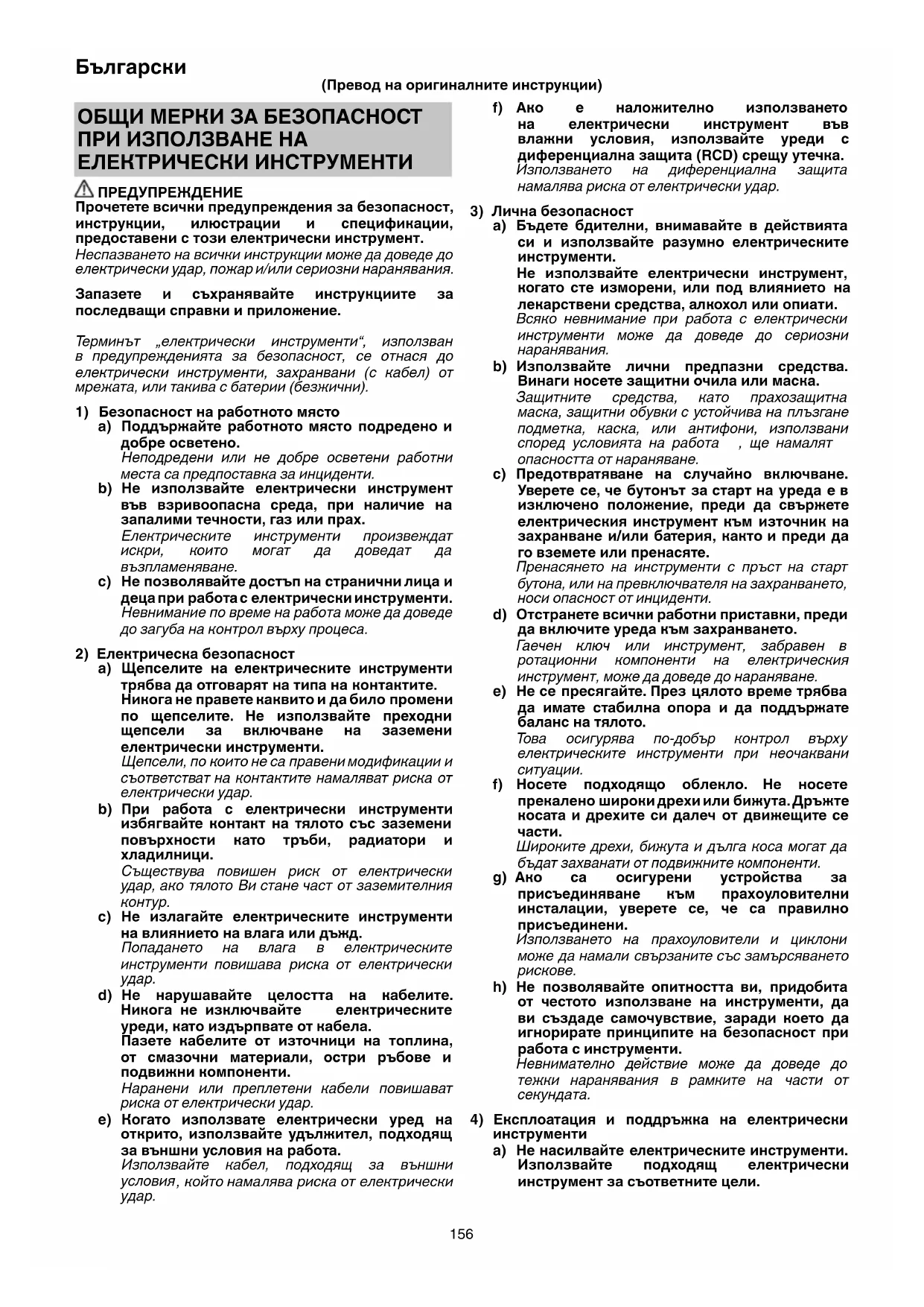 инструменти a) Не насилвайте електрическите инструменти. Използвайте подходящ електрически инструмент за съответните цели. ОБЩИ МЕРКИ ЗА БЕЗОПАСНОСТ ПРИ ИЗПОЛЗВАНЕ НА ЕЛЕКТРИЧЕСКИ ИНСТРУМЕНТИ ПРЕДУПРЕЖДЕНИЕ Прочетете всички предупреждения за безопасност, инструкции, илюстрации и спецификации, предоставени с този електрически инструмент. Неспазването на всички инструкции може да доведе до електрически удар, пожар и/или сериозни наранявания. Запазете и съхранявайте инструкциите за последващи справки и приложение. Терминът „електрически инструменти“, използван в предупрежденията за безопасност, се отнася до електрически инструменти, захранвани (с кабел) от мрежата, или такива с батерии (безжични).