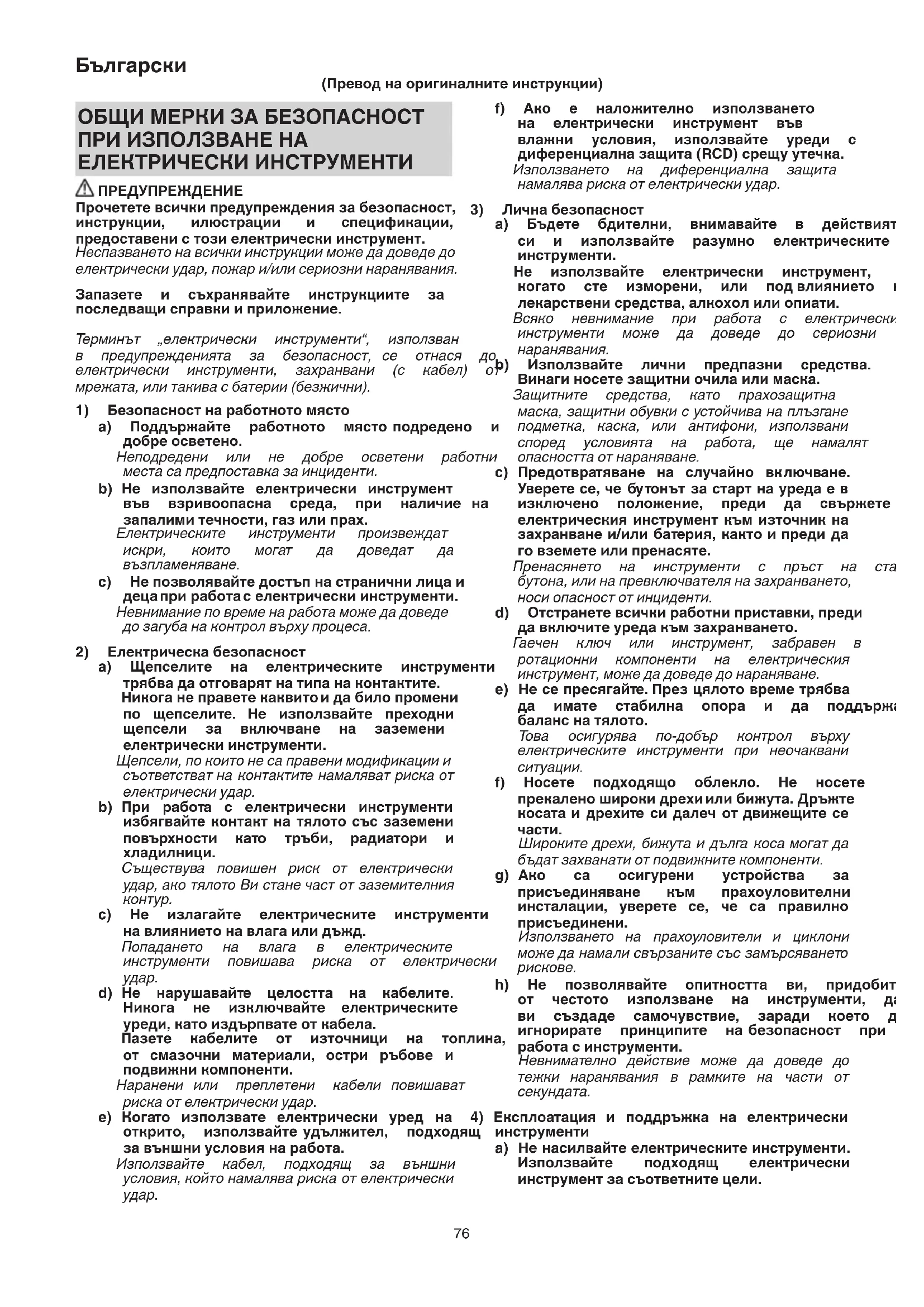 a) Обслужването на електрическите инструменти трябва да се извършва само отквалифициранисервизниработници,при използваненаоригиналнирезервничасти. Това щегарантирабезопасността приработас електрическитеинструменти.