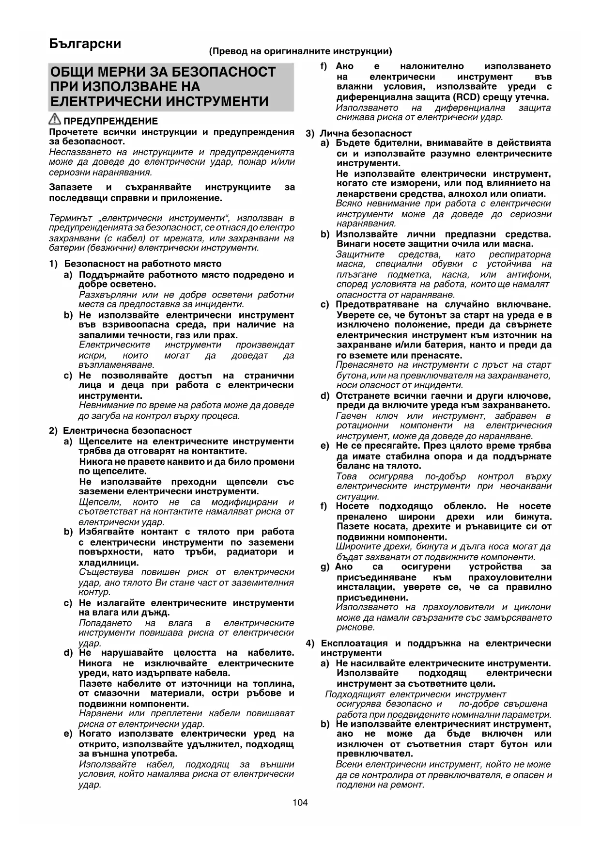 инструменти a) Не насилвайте електрическите инструменти. Използвайте подходящ електрически инструмент за съответните цели. Подходящият електрически инструмент осигурява безопасно и по-добре свършена работа при предвидените номинални параметри. b) Не използвайте електрическият инструмент, ако не може да бъде включен или изключен от съответния старт бутон или превключвател. Всеки електрически инструмент, който не може да се контролира от превключвателя, е опасен и подлежи на ремонт. ОБЩИ МЕРКИ ЗА БЕЗОПАСНОСТ ПРИ ИЗПОЛЗВАНЕ НА ЕЛЕКТРИЧЕСКИ ИНСТРУМЕНТИ ПРЕДУПРЕЖДЕНИЕ Прочетете всички инструкции и предупреждения за безопасност. Неспазването на инструкциите и предупрежденията може да доведе до електрически удар, пожар и/или сериозни наранявания. Запазете и съхранявайте инструкциите за последващи справки и приложение. Терминът „електрически инструменти“, използван в предупрежденията за безопасност, се отнася до електро захранвани (с кабел) от мрежата, или захранвани на батерии (безжични) електрически инструменти.