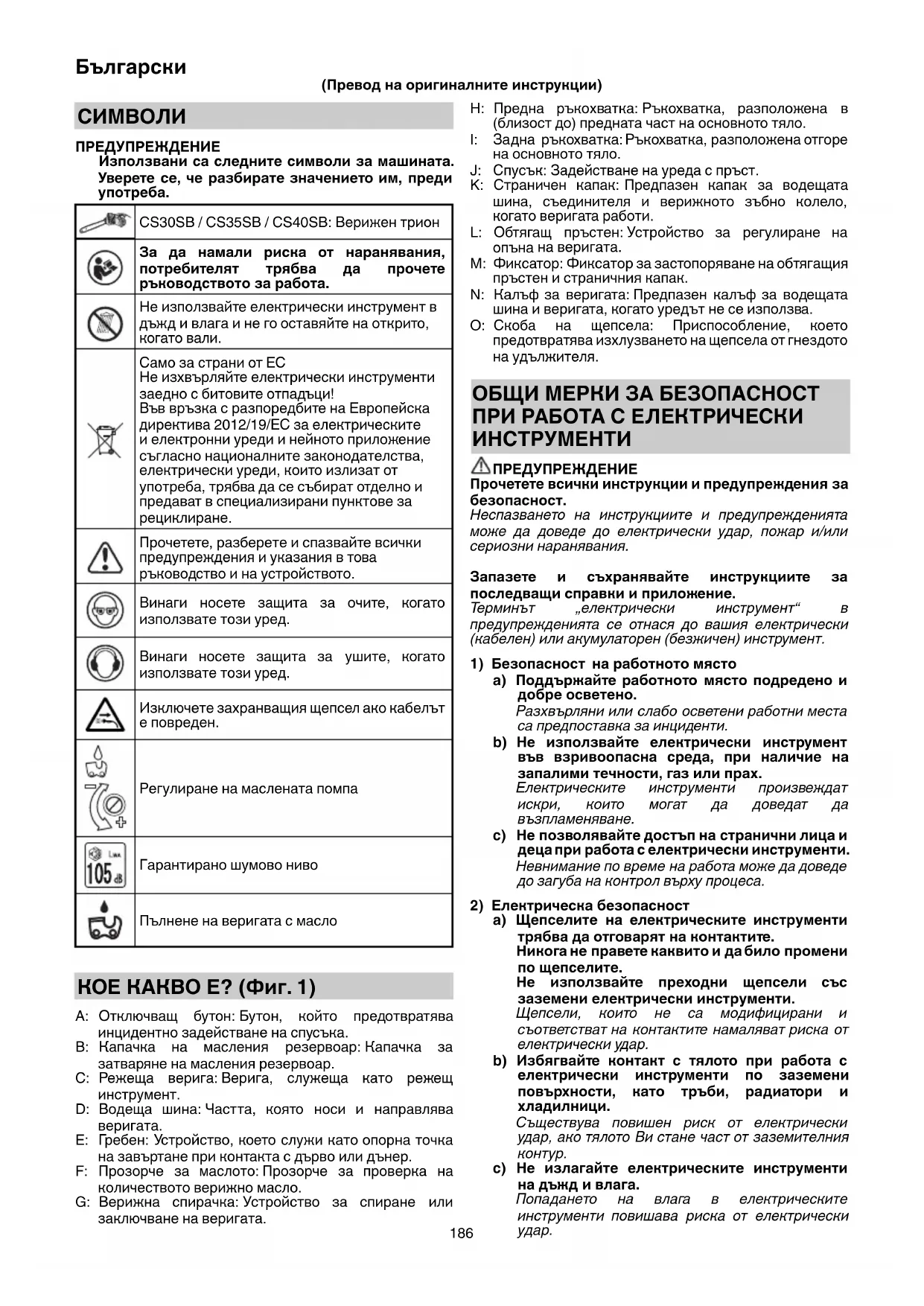 CS30SB / CS35SB / CS40SB: Верижен трион За да намали риска от наранявания, потребителят трябва да прочете ръководството за работа. Не използвайте електрически инструмент в дъжд и влага и не го оставяйте на открито, когато вали. Само за страни от ЕС Не изхвърляйте електрически инструменти заедно с битовите отпадъци! Във връзка с разпоредбите на Европейска директива 2012/19/ЕС за електрическите и електронни уреди и нейното приложение съгласно националните законодателства, електрически уреди, които излизат от употреба, трябва да се събират отделно и предават в специализирани пунктове за рециклиране. Прочетете, разберете и спазвайте всички предупреждения и указания в това ръководство и на устройството. Винаги носете защита за очите, когато използвате този уред. Винаги носете защита за ушите, когато използвате този уред. Изключете захранващия щепсел ако кабелът е повреден. Регулиране на маслената помпа Гарантирано шумово ниво Пълнене на веригата с масло КОЕ КАКВО Е? (Фиг. 1) A: Отключващ бутон: Бутон, който предотвратява инцидентно задействане на спусъка. B: Капачка на масления резервоар: Капачка за затваряне на масления резервоар. C: Режеща верига: Верига, служеща като режещ инструмент. D: Водеща шина: Частта, която носи и направлява
