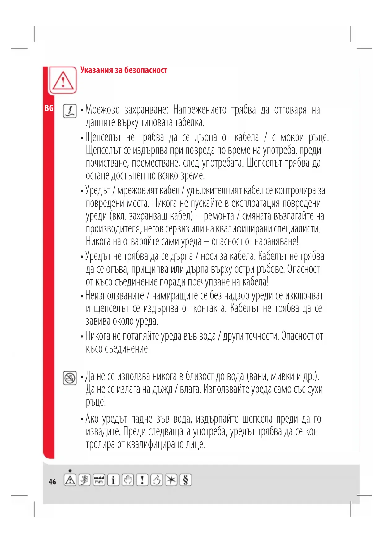 - Да не се използва никога в близост до вода (вани, мивки и др.). Да не се излага на дъжд / влага. Използвайте уреда само със сухи ръце!47 Указания за безопасност