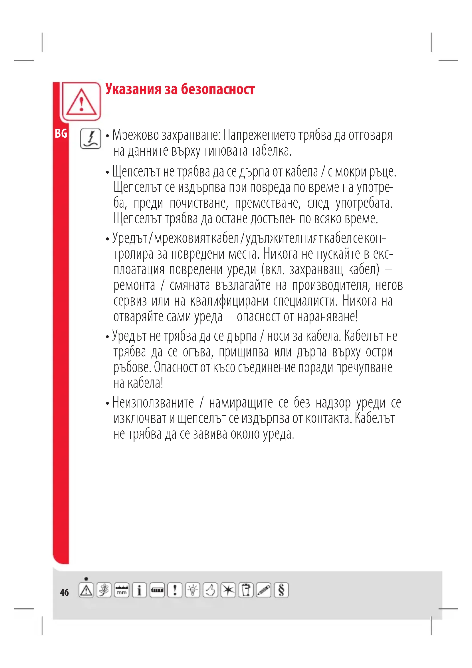 - Неизползваните / намиращите се без надзор уреди се изключват и щепселът се издърпва от контакта. Кабелът не трябва да се завива около уреда. Указания за безопасност47