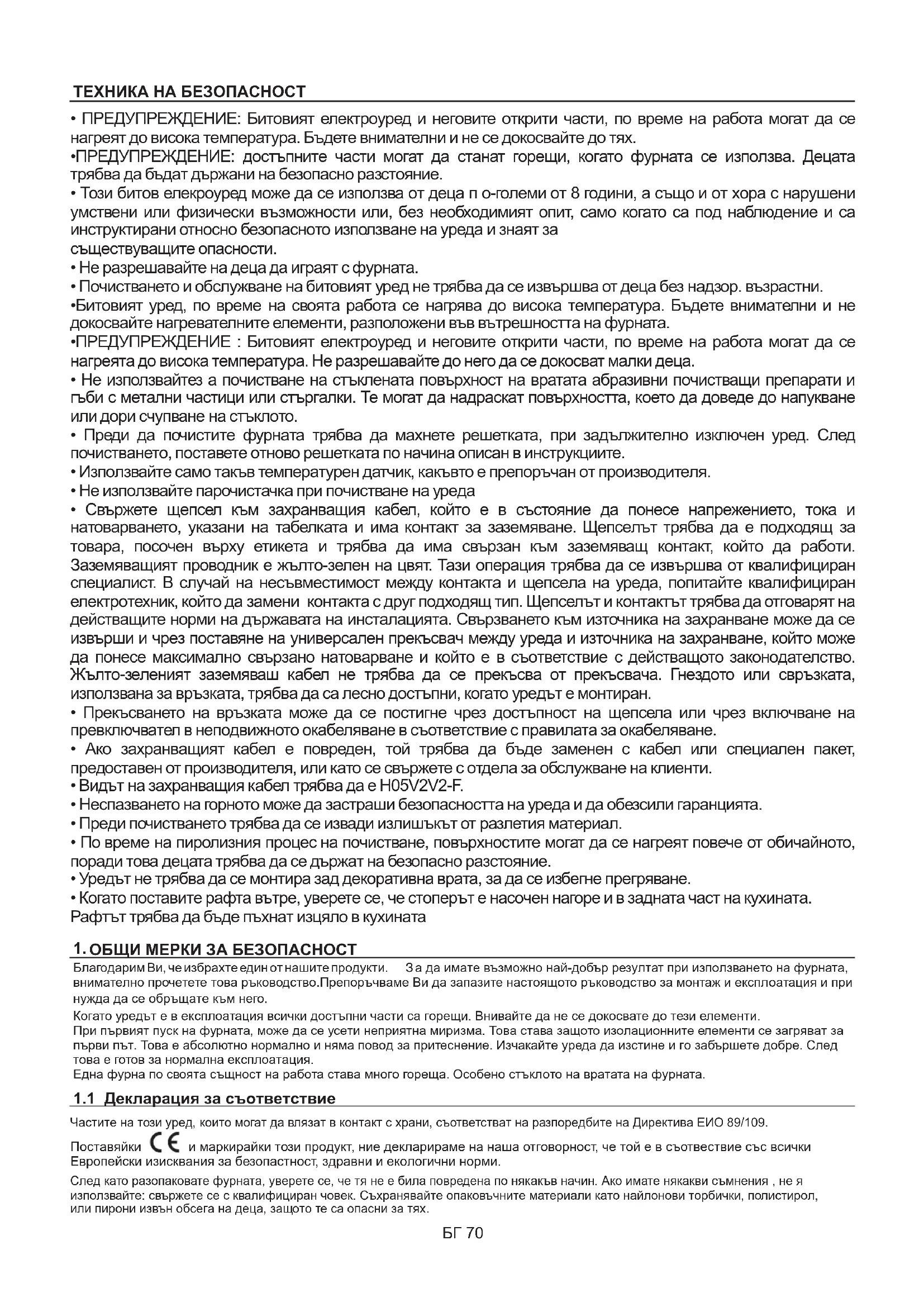 ОБЩИ МЕРКИ ЗА БЕЗОПАСНОСТ Благодарим Ви че избрахтеедин от нашите продукти, . З а да имате възможно най-добър резултат при използването на фурната, внимателно прочетете това ръководство Препоръчваме Ви да запазите настоящото ръководство за монтаж и експлоатация и при. нужда да се обръщате към него. Когатоуредътевексплоатация всички достъпни части са горещи Внивайте да не се докосвате до тези елементи.. При първият пуск на фурната може да се усети неприятна миризма Това става защото изолационните елементи се загряват за,. първи път Това е абсолютно нормално и няма повод за притеснение Изчакайте уреда да изстине и го забършете добре След... това е готов за нормална експлоатация. Една фурна по своята същност на работа става много гореща Особено стъклото на вратата на фурната.. Частите на този уред които могат да влязат в контакт с храни съответстват на разпоредбите на Директива ЕИО, , 89/109.