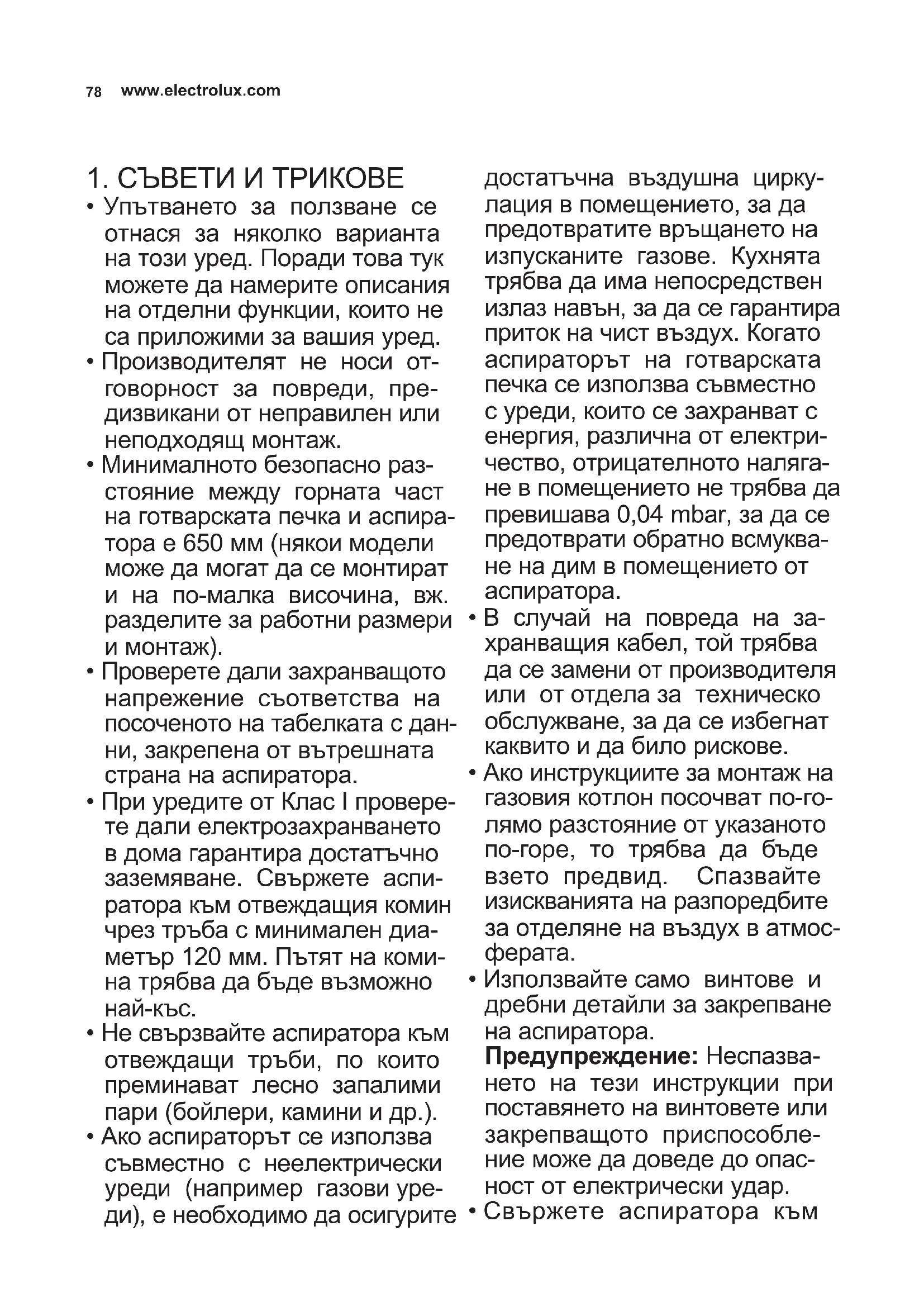 - Не свързвайте аспиратора към отвеждащи тръби, по които преминават лесно запалими пари (бойлери, камини и др.).