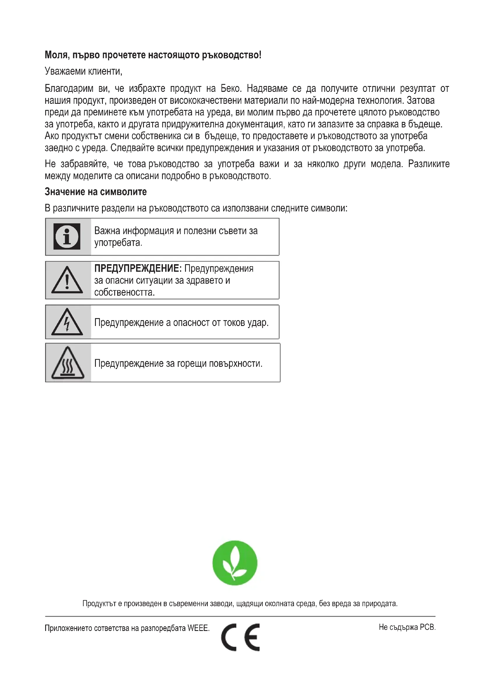 WARNUNG: Bevor Sie die Glühlampen anfassen, sollten Sie sicherstellen, dass diese abgekühlt sind. Wenden Sie sich zum Auswechseln der Lampe an einen Vertreter des autorisierten Kundendienstes.Продуктът е произведен в съвременни заводи, щадящи околната среда, без вреда за природата. Приложението сответства на разпоредбата WEEE. Не съдържа РСВ. Моля, първо прочетете настоящото ръководство! Уважаеми клиенти, Благодарим ви, че избрахте продукт на Беко. Надяваме се да получите отлични резултат от нашия продукт, произведен от висококачествени материали по най-модерна технология. Затова преди да преминете към употребата на уреда, ви молим първо да прочетете цялото ръководство за употреба, както и другата придружителна документация, като ги запазите за справка в бъдеще. Ако продуктът смени собственика си в бъдеще, то предоставете и ръководството за употреба заедно с уреда. Следвайте всички предупреждения и указания от ръководството за употреба. Не забравяйте, че това ръководство за употреба важи и за няколко други модела. Разликите между моделите са описани подробно в ръководството. Значение на символите В различните раздели на ръководството са използвани следните символи: