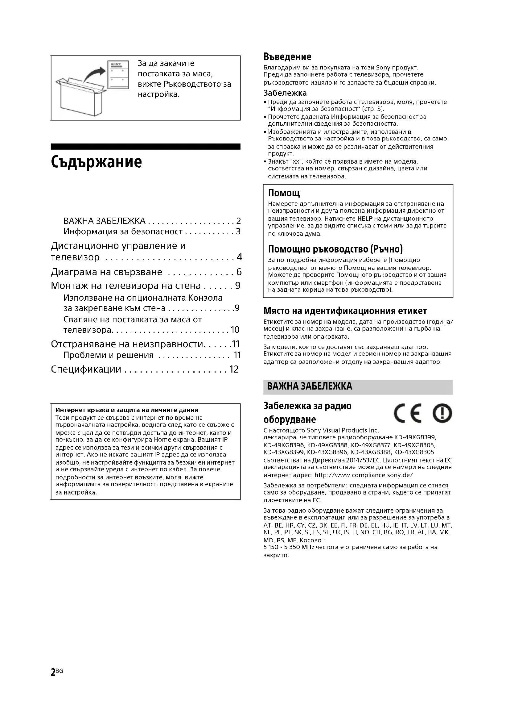 С настоящото Sony Visual Products Inc. декларира, че типовете радиооборудване KD-49XG8399, KD-49XG8396, KD-49XG8388, KD-49XG8377, KD-49XG8305, KD-43XG8399, KD-43XG8396, KD-43XG8388, KD-43XG8305 съответстват на Директива 2014/53/ЕС. Цялостният текст на ЕС декларацията за съответствие може да се намери на следния интернет адрес: http://www.compliance.sony.de/Забележка за потребители: следната информация се отнася само за оборудване, продавано в страни, където се прилагат директивите на ЕС.За това радио оборудване важат следните ограничения за въвеждане в експлоатация или за разрешение за употреба в AT, BE, HR, CY, CZ, DK, EE, FI, FR, DE, EL, HU, IE, IT, LV, LT, LU, MT, NL, PL, PT, SK, SI, ES, SE, UK, IS, LI, NO, CH, BG, RO, TR, AL, BA, MK, MD, RS, ME, Косово : 5 150 - 5 350 MHz честота е ограничена само за работа на За да закачите поставката за маса, вижте Ръководството за