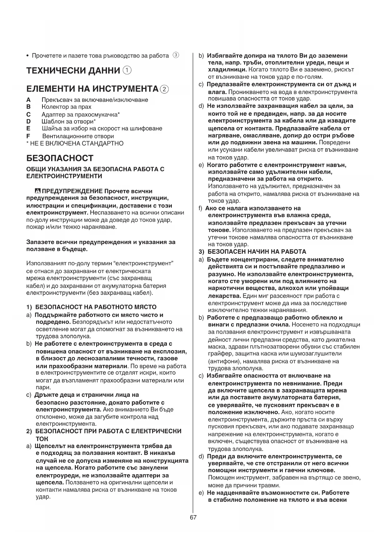 - НЕ Е ВКЛЮЧЕНА СТАНДАРТНО БЕЗОПАСНОСТ ОБЩИ УКАЗАНИЯ ЗА БЕЗОПАСНА РАБОТА С ЕЛЕКТРОИНСТРУМЕНТИ - ПРЕДУПРЕЖДЕНИЕ Прочете всички предупреждения за безопасност, инструкции, илюстрации и спецификации, доставени с този електроинструмент. Неспазването на всички описани по-долу инструкции може да доведе до токов удар, пожар и/или тежко нараняване. Запазете всички предупреждения и указания за ползване в бъдеще. Използваният по-долу термин “електроинструмент” се отнася до захранвани от електрическата мрежа електроинструменти (със захранващ кабел) и до захранвани от акумулаторна батерия електроинструменти (без захранващ кабел).