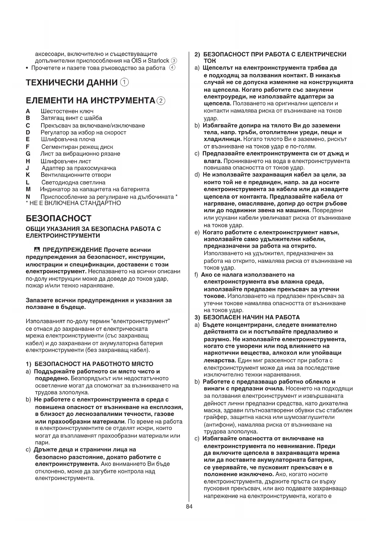 a) Бъдете концентрирани, следете внимателно действията си и постъпвайте предпазливо и разумно. Не използвайте електроинструмента, когато сте уморени или под влиянието на наркотични вещества, алкохол или упойващи лекарства. Един миг разсеяност при работа с електроинструмент може да има за последствие изключително тежки наранявания. b) Работете с предпазващо работно облекло и винаги с предпазни очила. Носенето на подходящи за ползвания електроинструмент и извършваната дейност лични предпазни средства, като дихателна маска, здрави плътнозатворени обувки със стабилен грайфер, защитна каска или шумозаглушители (антифони), намалява риска от възникване на трудова злополука. c) Избягвайте опасността от включване на електроинструмента по невнимание. Преди да включите щепсела в захранващата мрежа или да поставите акумулаторната батерия, се уверявайте, че пусковият прекъсвач е в положение изключено. Ако, когато носите електроинструмента, държите пръста си върху пусковия прекъсвач, или ако подавате захранващо напрежение на електроинструмента, когато е аксесоари, включително и съществуващите допълнителни приспособления на OIS и Starlock