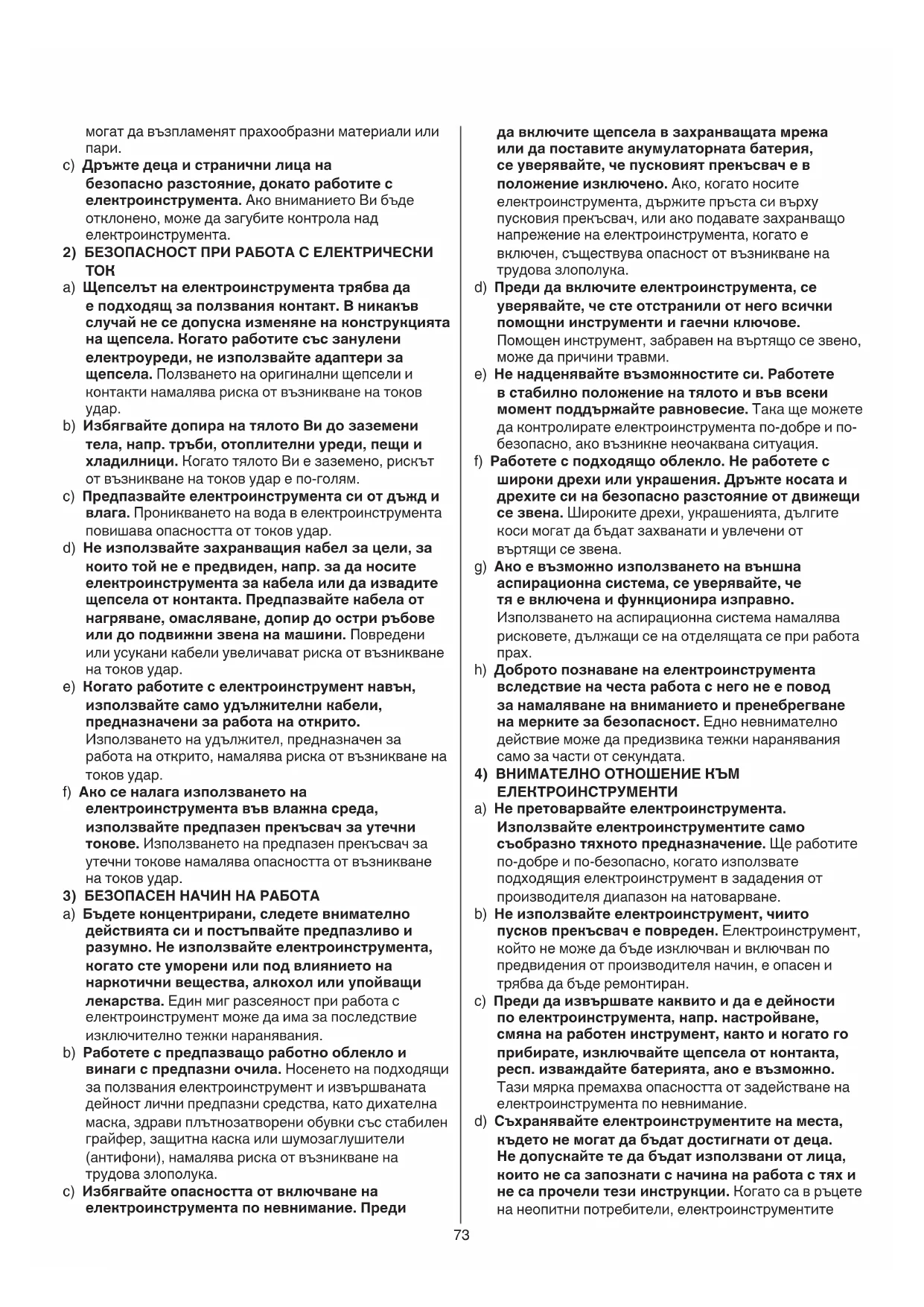 a) Бъдете концентрирани, следете внимателно действията си и постъпвайте предпазливо и разумно. Не използвайте електроинструмента, когато сте уморени или под влиянието на наркотични вещества, алкохол или упойващи лекарства. Един миг разсеяност при работа с електроинструмент може да има за последствие изключително тежки наранявания. b) Работете с предпазващо работно облекло и винаги с предпазни очила. Носенето на подходящи за ползвания електроинструмент и извършваната дейност лични предпазни средства, като дихателна маска, здрави плътнозатворени обувки със стабилен грайфер, защитна каска или шумозаглушители (антифони), намалява риска от възникване на трудова злополука. c) Избягвайте опасността от включване на електроинструмента по невнимание. Преди74