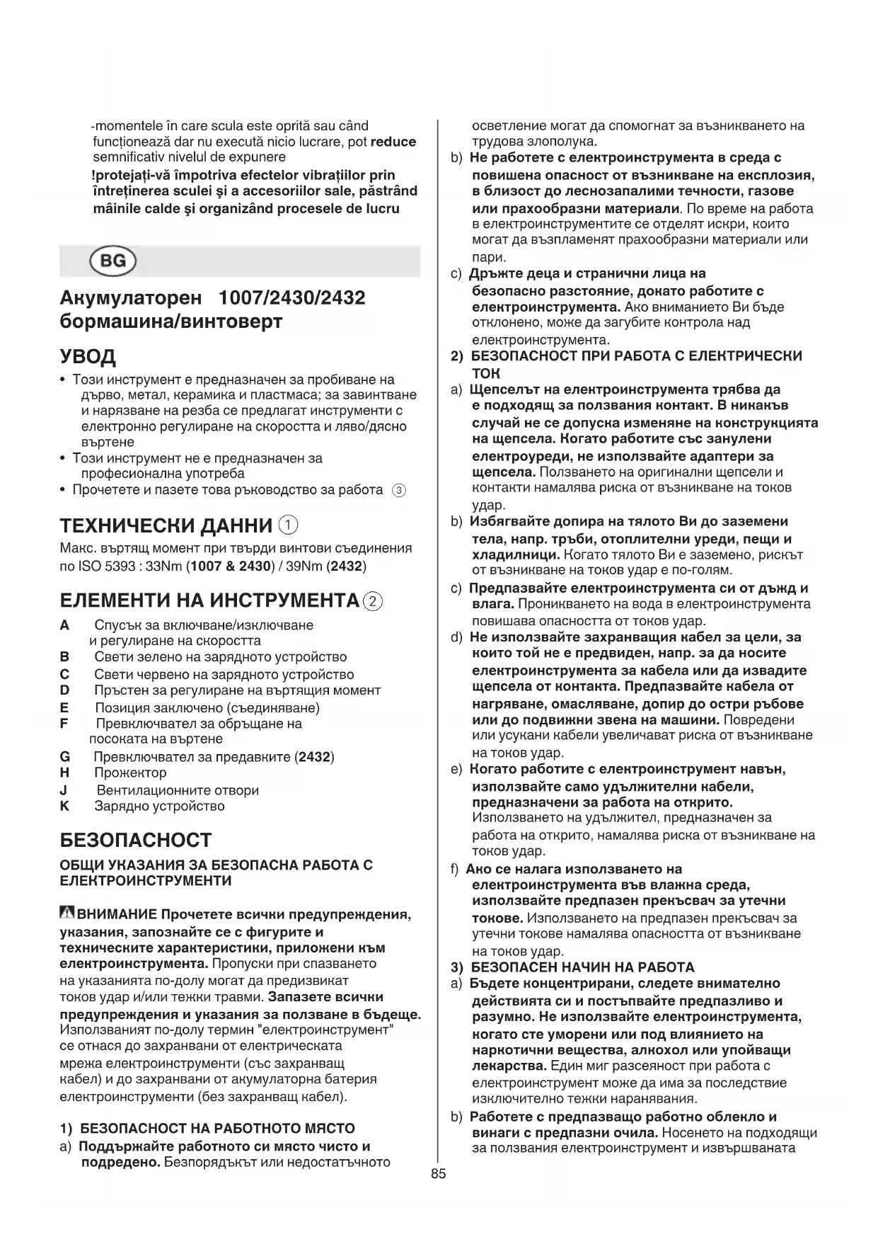 A Спусък за включване/изключване и pегулиpане на скоpостта B Свети зелено на зарядното устройство C Свети червено на зарядното устройство D Пръстен за регулиране на въртящия момент E Позиция заключено (съединяване) F Пpевключвател за обpъщане на посоката на въpтене G Превключвател за предавките (2432) H Прожектор J Вентилационните отвоpи K Зарядно устройство БЕЗОПАСНОСТ ОБЩИ УКАЗАНИЯ ЗА БЕЗОПАСНА РАБОТА С ЕЛЕКТРОИНСТРУМЕНТИ ВНИМАНИЕ Прочетете всички предупреждения, указания, запознайте се с фигурите и техническите характеристики, приложени към електроинструмента. Пропуски при спазването на указанията по-долу могат да предизвикат токов удар и/или тежки травми. Запазете всички предупреждения и указания за ползване в бъдеще. Използваният по-долу термин "електроинструмент" се отнася до захранвани от електрическата мрежа електроинструменти (със захранващ кабел) и до захранвани от акумулаторна батерия електроинструменти (без захранващ кабел).
