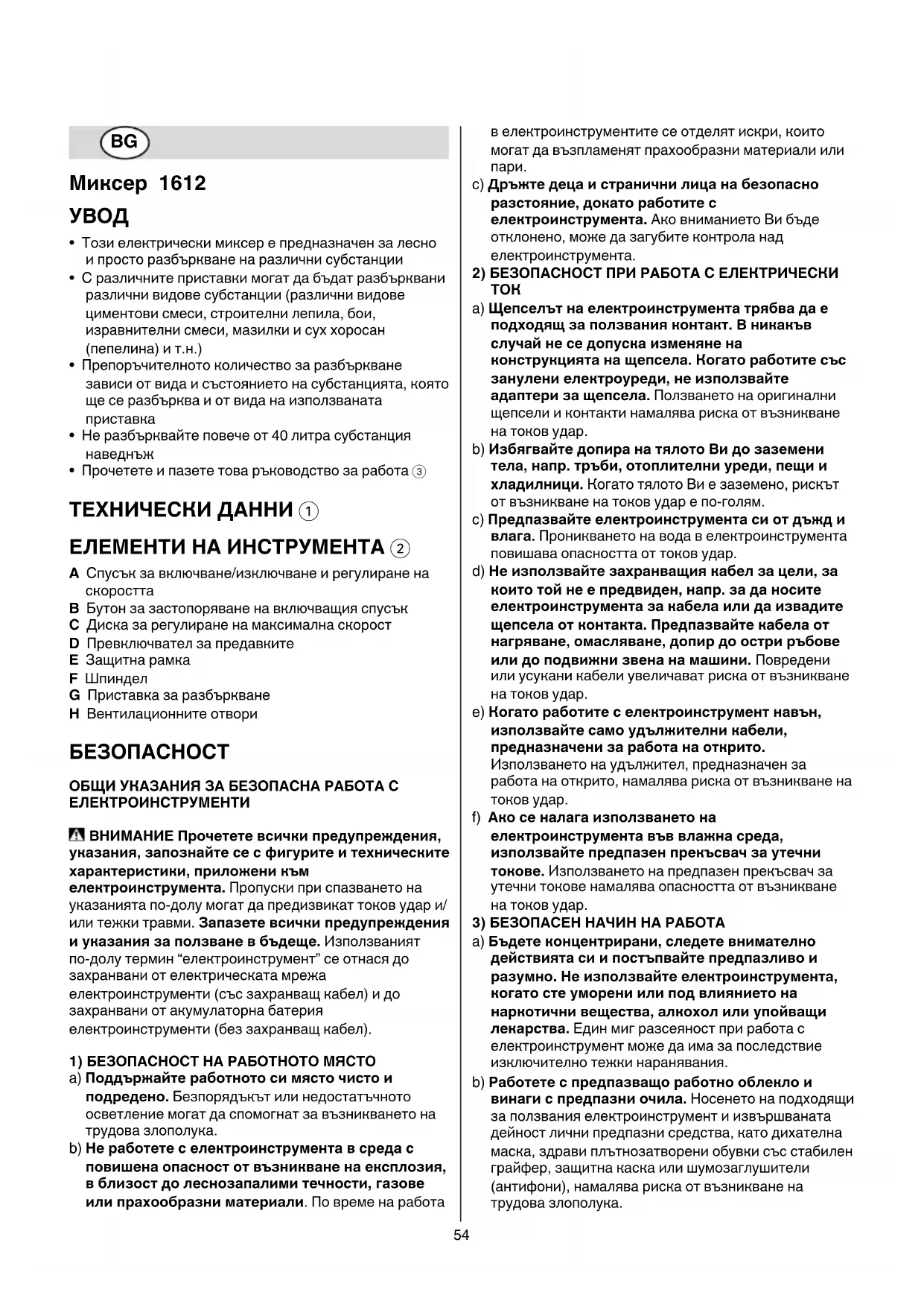 - Прочетете и пазете това ръководство за работа 3 ТЕXHИЧЕСКИ ДАННИ 1 ЕЛЕМЕНТИ НА ИНСТРУМЕНТА 2 A Спусък за включване/изключване и pегулиpане на скоpостта B Бутон за застопоpяване на включващия спусък C Диска за pегулиpане на максимална скоpост D Превключвател за предавките E Защитна рамка F Шпиндел G Приставка за разбъркване H Вентилационните отвоpи БЕЗОПАСНОСТ ОБЩИ УКАЗАНИЯ ЗА БЕЗОПАСНА РАБОТА С ЕЛЕКТРОИНСТРУМЕНТИ ВНИМАНИЕ Прочетете всички предупреждения, указания, запознайте се с фигурите и техническите характеристики, приложени към електроинструмента. Пропуски при спазването на указанията по-долу могат да предизвикат токов удар и/ или тежки травми. Запазете всички предупреждения и указания за ползване в бъдеще. Използваният по-долу термин “електроинструмент” се отнася до захранвани от електрическата мрежа електроинструменти (със захранващ кабел) и до захранвани от акумулаторна батерия електроинструменти (без захранващ кабел).