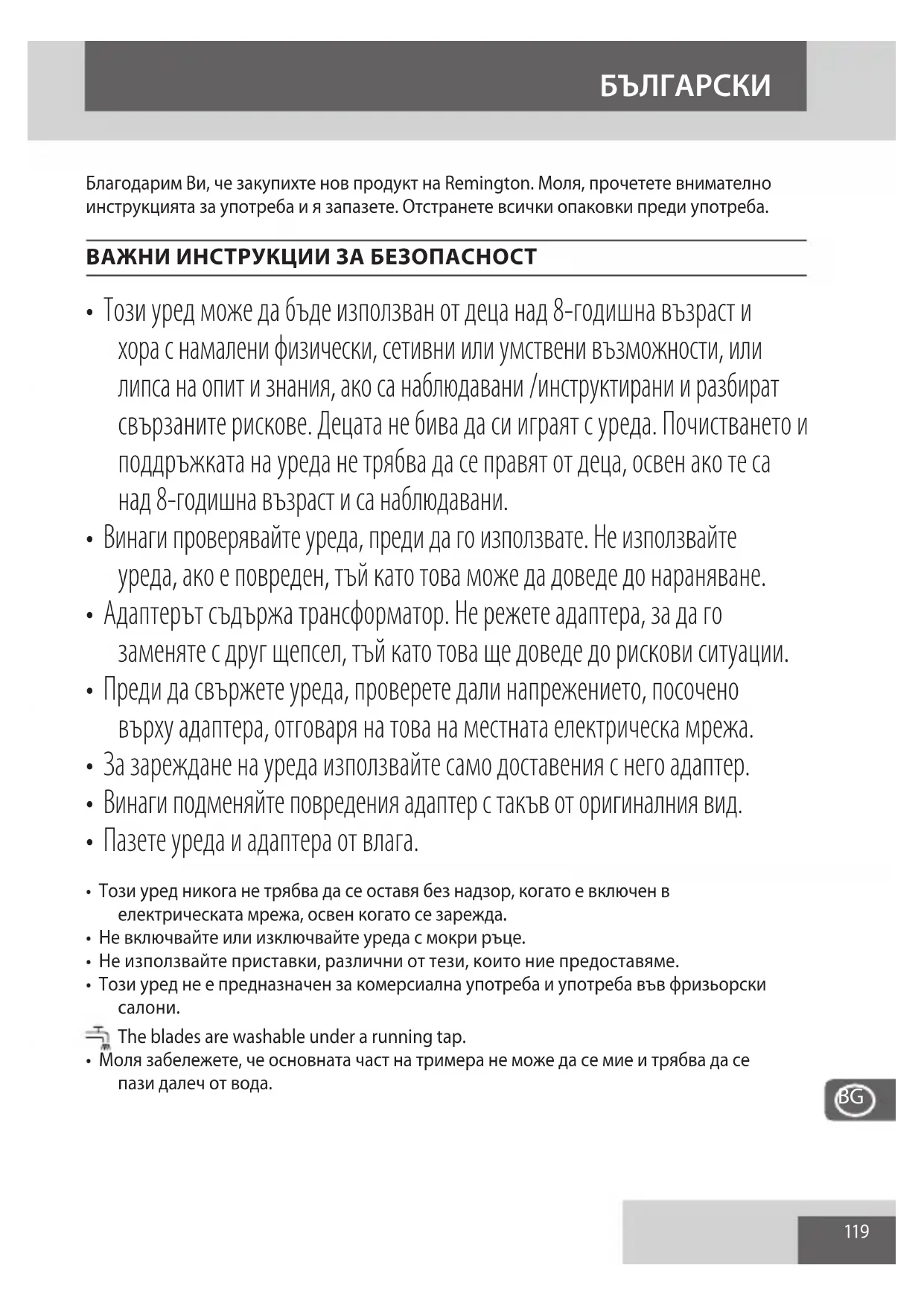 Благодарим Ви, че закупихте нов продукт на Remington. Моля, прочетете внимателно инструкцията за употреба и я запазете. Отстранете всички опаковки преди употреба. ВАЖНИ ИНСТРУКЦИИ ЗА БЕЗОПАСНОСТ