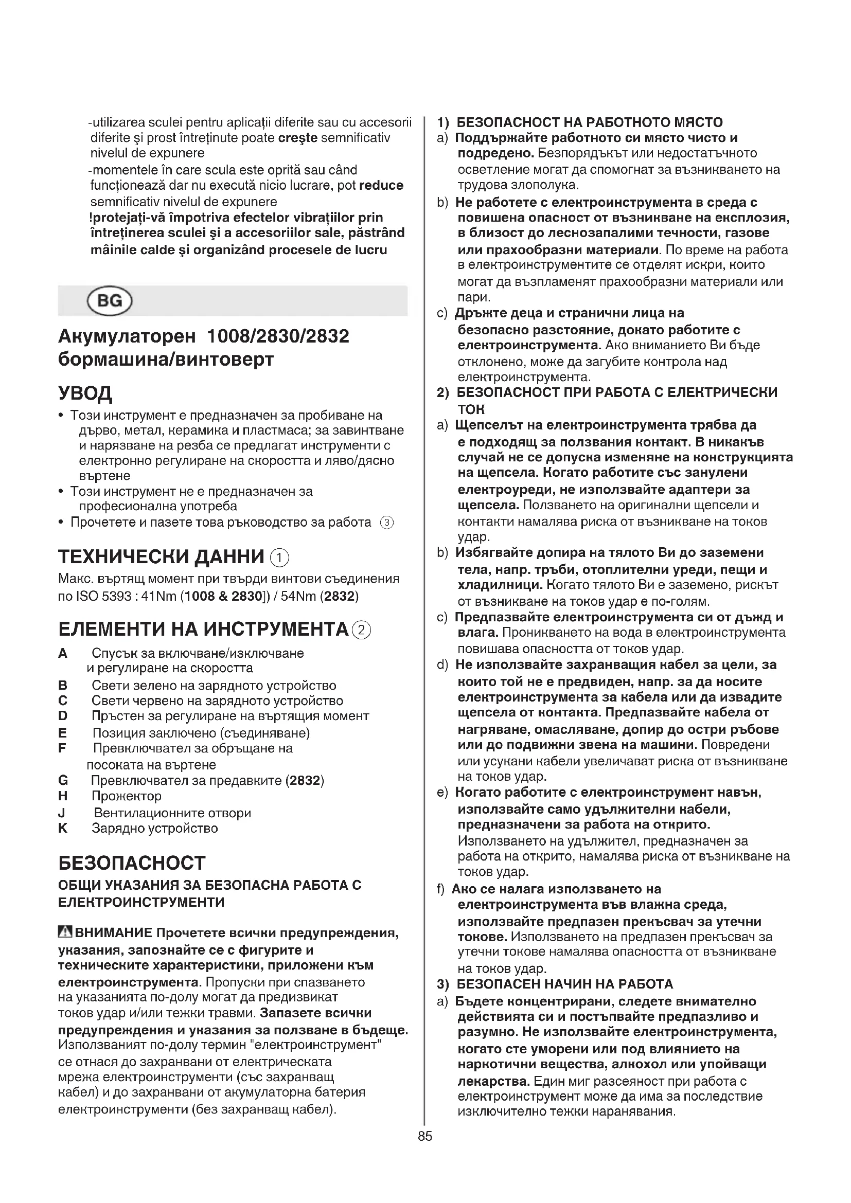 A Спусък за включване/изключване и pегулиpане на скоpостта B Свети зелено на зарядното устройство C Свети червено на зарядното устройство D Пръстен за регулиране на въртящия момент E Позиция заключено (съединяване) F Пpевключвател за обpъщане на посоката на въpтене G Превключвател за предавките (2832) H Прожектор J Вентилационните отвоpи K Зарядно устройство БЕЗОПАСНОСТ ОБЩИ УКАЗАНИЯ ЗА БЕЗОПАСНА РАБОТА С ЕЛЕКТРОИНСТРУМЕНТИ ВНИМАНИЕ Прочетете всички предупреждения, указания, запознайте се с фигурите и техническите характеристики, приложени към електроинструмента. Пропуски при спазването на указанията по-долу могат да предизвикат токов удар и/или тежки травми. Запазете всички предупреждения и указания за ползване в бъдеще. Използваният по-долу термин "електроинструмент" се отнася до захранвани от електрическата мрежа електроинструменти (със захранващ кабел) и до захранвани от акумулаторна батерия електроинструменти (без захранващ кабел).86 прибирате, изключвайте щепсела от контакта, респ. изваждайте батерията, ако е възможно. Тази мярка премахва опасността от задействане на електроинструмента по невнимание. d) Съхранявайте електроинструментите на места, където не могат да бъдат достигнати от деца. Не допускайте те да бъдат използвани от лица, които не са запознати с начина на работа с тях и не са прочели тези инструкции. Когато са в ръцете на неопитни потребители, електроинструментите могат да бъдат изключително опасни. e) Поддържайте добре електроинструментите си и аксесоарите им. Проверявайте дали подвижните звена функционират безукорно, дали не заклинват, дали има счупени или повредени детайли, които нарушават или изменят функциите на електроинструмента. Преди да използвате електроинструмента, се погрижете повредените детайли да бъдат ремонтирани. Много от трудовите злополуки се дължат на недобре поддържани електроинструменти и уреди. f) Поддържайте режещите инструменти винаги добре заточени и чисти. Добре поддържаните режещи инструменти с остри ръбове оказват по- малко съпротивление и се водят по-леко. g) Използвайте електроинструментите, допълнителните приспособления, работните инструменти и т.н., съобразно инструкциите на производителя. С дейности и процедури, евентуално предписани от различни нормативни документи. Използването на електроинструменти за различни от предвидените от производителя приложения повишава опасността от възникване на трудови злополуки. h) Поддържайте дръжките и ръкохватките сухи, чисти и неомаслени. Хлъзгавите дръжки и ръкохватки не позволяват безопасната работа и доброто контролиране на електроинструмента при възникване на неочаквана ситуация.
