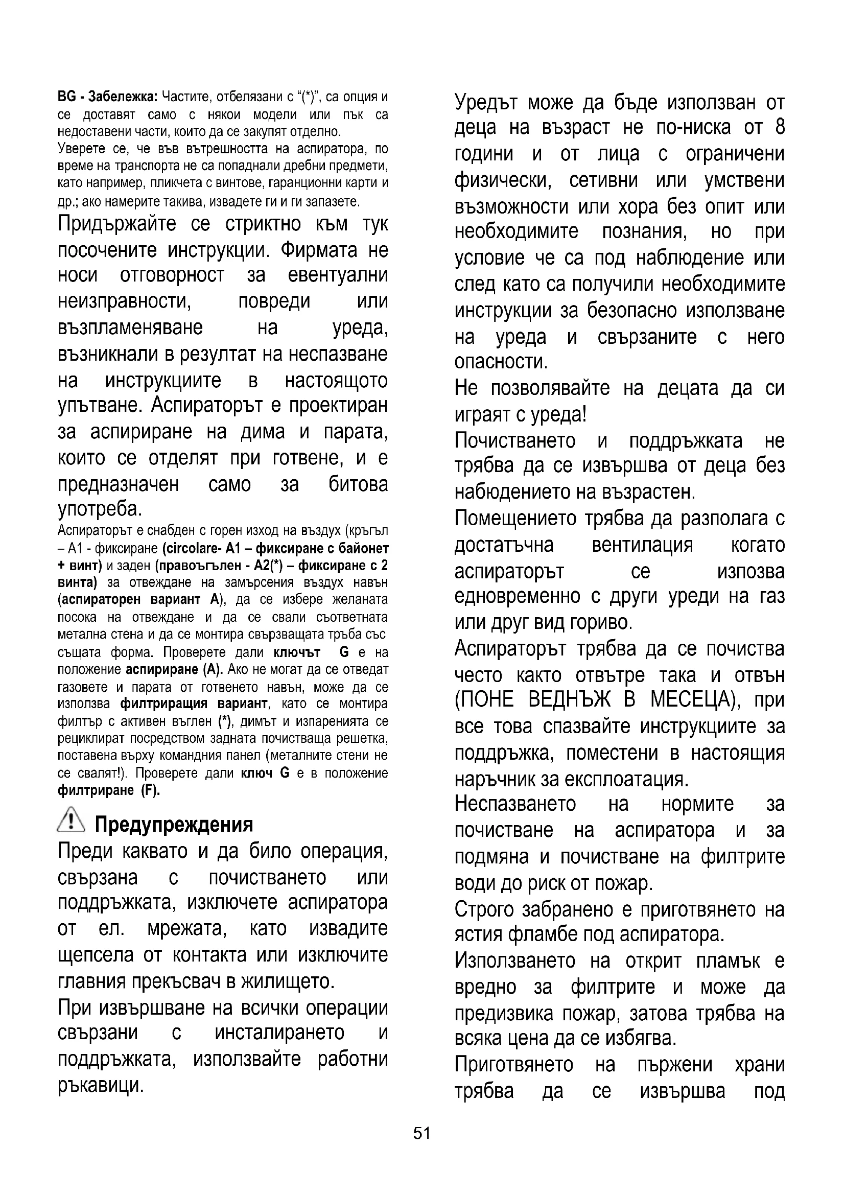 Аспираторът е снабден с горен изход на въздух (кръгъл – А1 - фиксиране (circolare- A1 – фиксиране с байонет + винт) и заден (правоъгълен - A2(*) – фиксиране с 2 винта) за отвеждане на замърсения въздух навън (аспираторен вариант A), да се избере желаната посока на отвеждане и да се свали съответната метална стена и да се монтира свързващата тръба със същата форма. Проверете дали ключът G е на положение аспириране (A). Ако не могат да се отведат газовете и парата от готвенето навън, може да се използва филтриращия вариант, като се монтира филтър с активен въглен (*), димът и изпаренията се рециклират посредством задната почистваща решетка, поставена върху командния панел (металните стени не се свалят!). Проверете дали ключ G е в положение филтриране (F). Предупреждения Преди каквато и да било операция, свързана с почистването или поддръжката, изключете аспиратора от ел. мрежата, като извадите щепсела от контакта или изключите главния прекъсвач в жилището. При извършване на всички операции свързани с инсталирането и поддръжката, използвайте работни