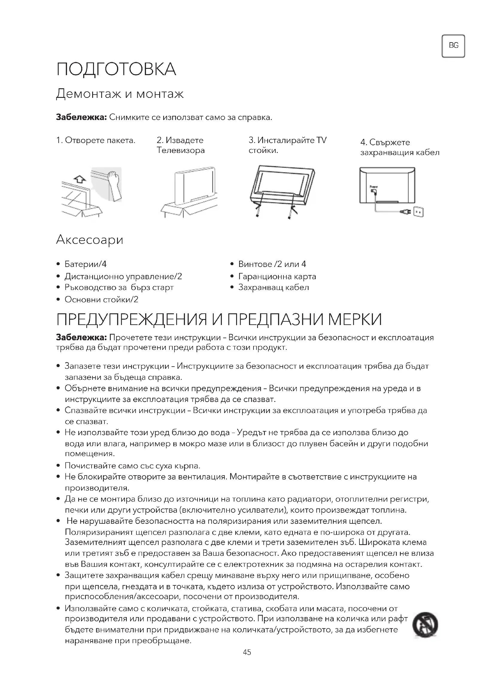 - Ако инсталирате телевизора на таван или наклонена стена, той може да падне и да доведе до тежки наранявания. Използвайте оторизиран монтаж на стена и се свържете с местния търговец или квалифициран персонал. В противен случай тя не е покрита от гаранцията.