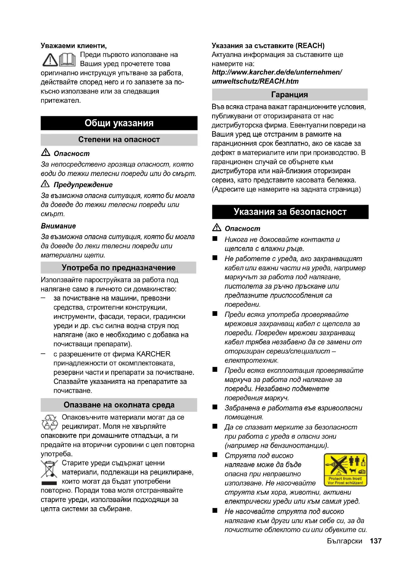 Не насочвайте струята под високо налягане към други или към себе си, за да почистите облеклото си или обувките си. Общи указания Степени на опасност Употреба по предназначение Опазване на околната среда