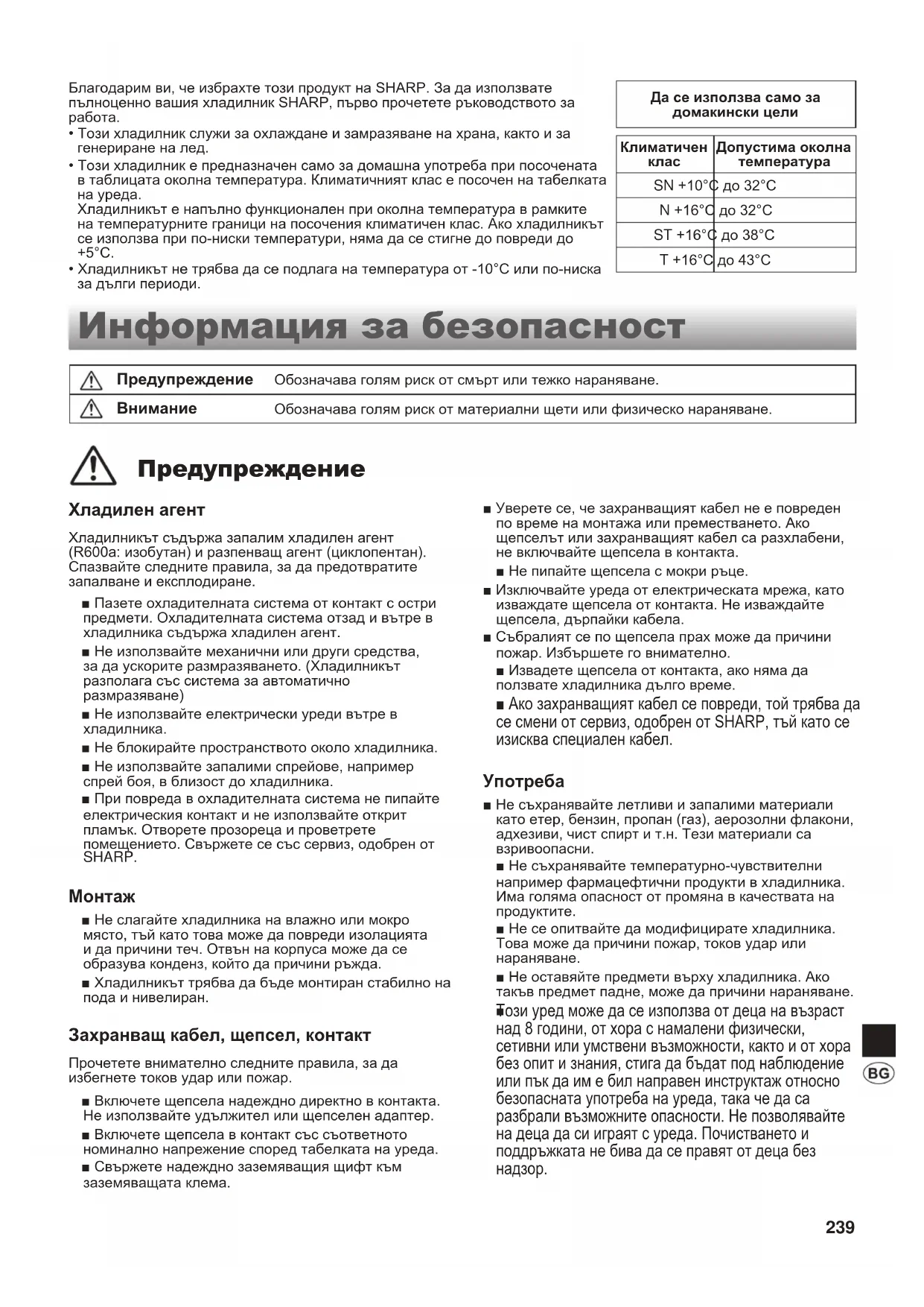 (B656)P226-P238_Ukr.indd 238 2015/05/28 17:36:05239 Да се използва само за домакински цели Благодарим ви, че избрахте този продукт на SHARP. За да използвате пълноценно вашия хладилник SHARP, първо прочетете ръководството за