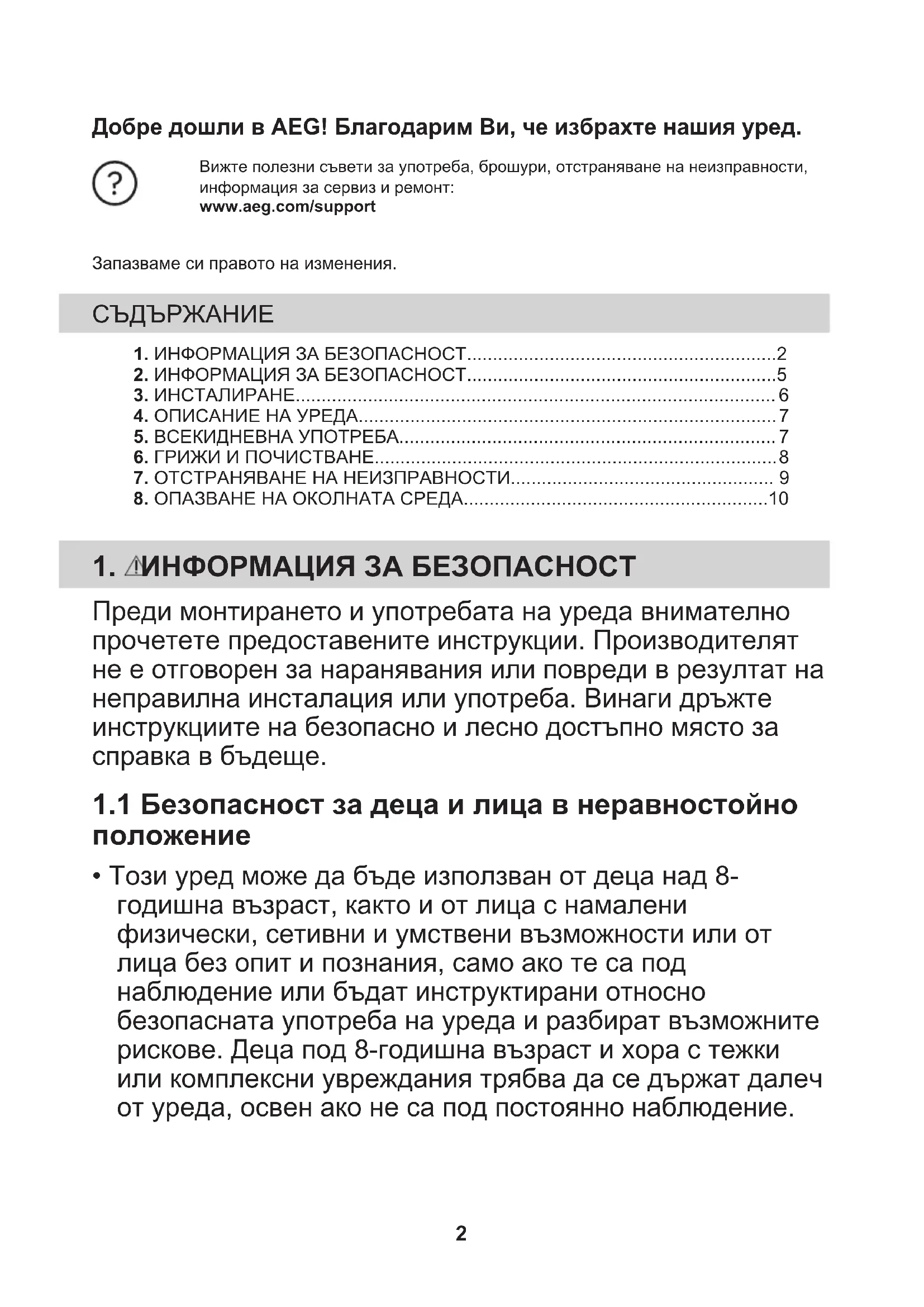 Рециклирайте материалите със символа . Поставяйте опаковките в съответните контейнери за рециклирането им. Помогнете за опазването на околната среда и човешкото здраве, както и за рециклирането на отпадъци от електрически и електронни уреди. Не изхвърляйте уредите, означени със символаl , заедно с битовата смет. Върнете уреда в местния пункт за рециклиране или се обърнете към вашата общинска служба. 10Benvinguts a AEG! Gràcies per triar el nostre electrodomèstic. Consells d'ús, catàlegs, instruccions per a la resolució de problemes, informaciósobre servei i reparacions:www.aeg.com/supportSubjecte a canvis sense preavís. CONTINGUT