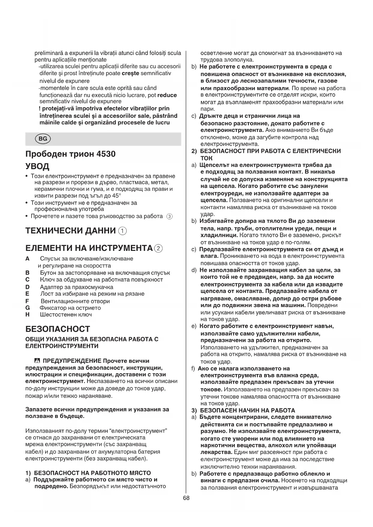 ЕЛЕКТРОИНСТРУМЕНТИ a) Не претоварвайте електроинструмента. Използвайте електроинструментите само съобразно тяхното предназначение. Ще работите по-добре и по-безопасно, когато използвате подходящия електроинструмент в зададения от производителя диапазон на натоварване. b) Не използвайте електроинструмент, чиито пусков прекъсвач е повреден. Електроинструмент, който не може да бъде изключван и включван по предвидения от производителя начин, е опасен и трябва да бъде ремонтиран. c) Преди да извършвате каквито и да е дейности по електроинструмента, напр. настройване, смяна на работен инструмент, както и когато го прибирате, изключвайте щепсела от контакта, респ. изваждайте батерията, ако е възможно. Тази мярка премахва опасността от задействане на70