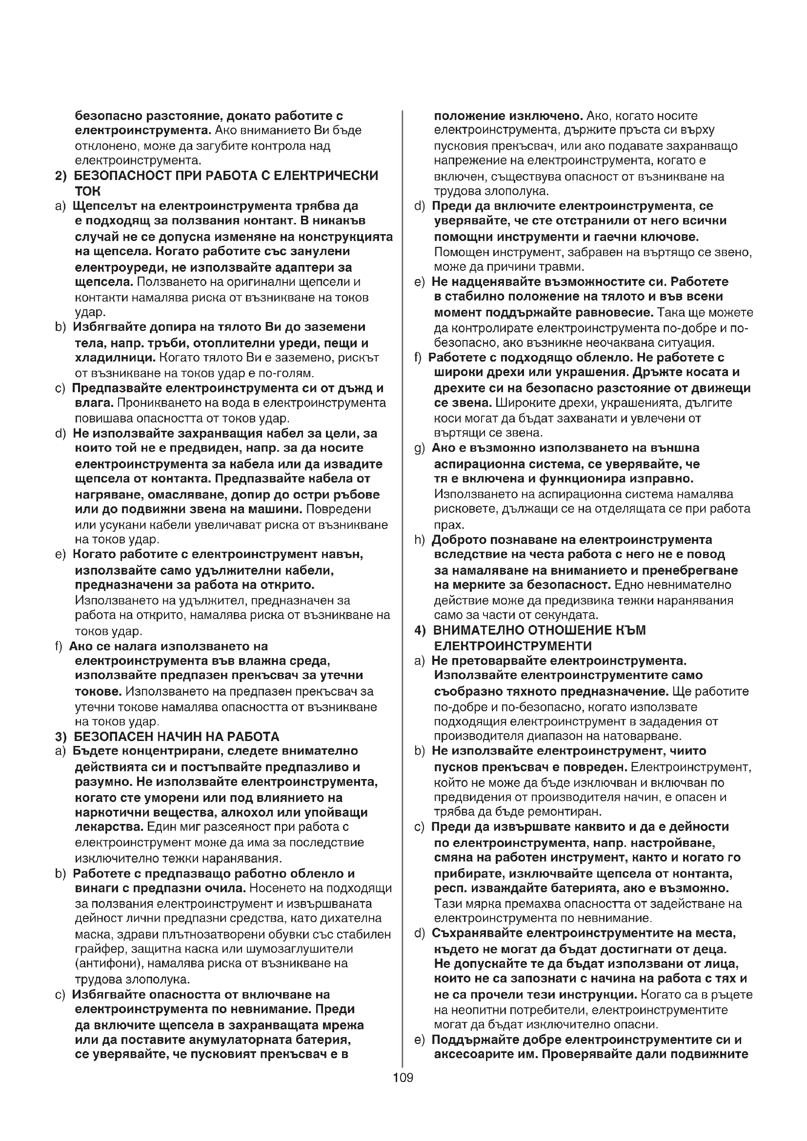 ЕЛЕКТРОИНСТРУМЕНТИ a) Не претоварвайте електроинструмента. Използвайте електроинструментите само съобразно тяхното предназначение. Ще работите по-добре и по-безопасно, когато използвате подходящия електроинструмент в зададения от производителя диапазон на натоварване. b) Не използвайте електроинструмент, чиито пусков прекъсвач е повреден. Електроинструмент, който не може да бъде изключван и включван по предвидения от производителя начин, е опасен и трябва да бъде ремонтиран. c) Преди да извършвате каквито и да е дейности по електроинструмента, напр. настройване, смяна на работен инструмент, както и когато го прибирате, изключвайте щепсела от контакта, респ. изваждайте батерията, ако е възможно. Тази мярка премахва опасността от задействане на електроинструмента по невнимание. d) Съхранявайте електроинструментите на места, където не могат да бъдат достигнати от деца. Не допускайте те да бъдат използвани от лица, които не са запознати с начина на работа с тях и не са прочели тези инструкции. Когато са в ръцете на неопитни потребители, електроинструментите могат да бъдат изключително опасни. e) Поддържайте добре електроинструментите си и аксесоарите им. Проверявайте дали подвижните безопасно разстояние, докато работите с електроинструмента. Ако вниманието Ви бъде отклонено, може да загубите контрола над електроинструмента.