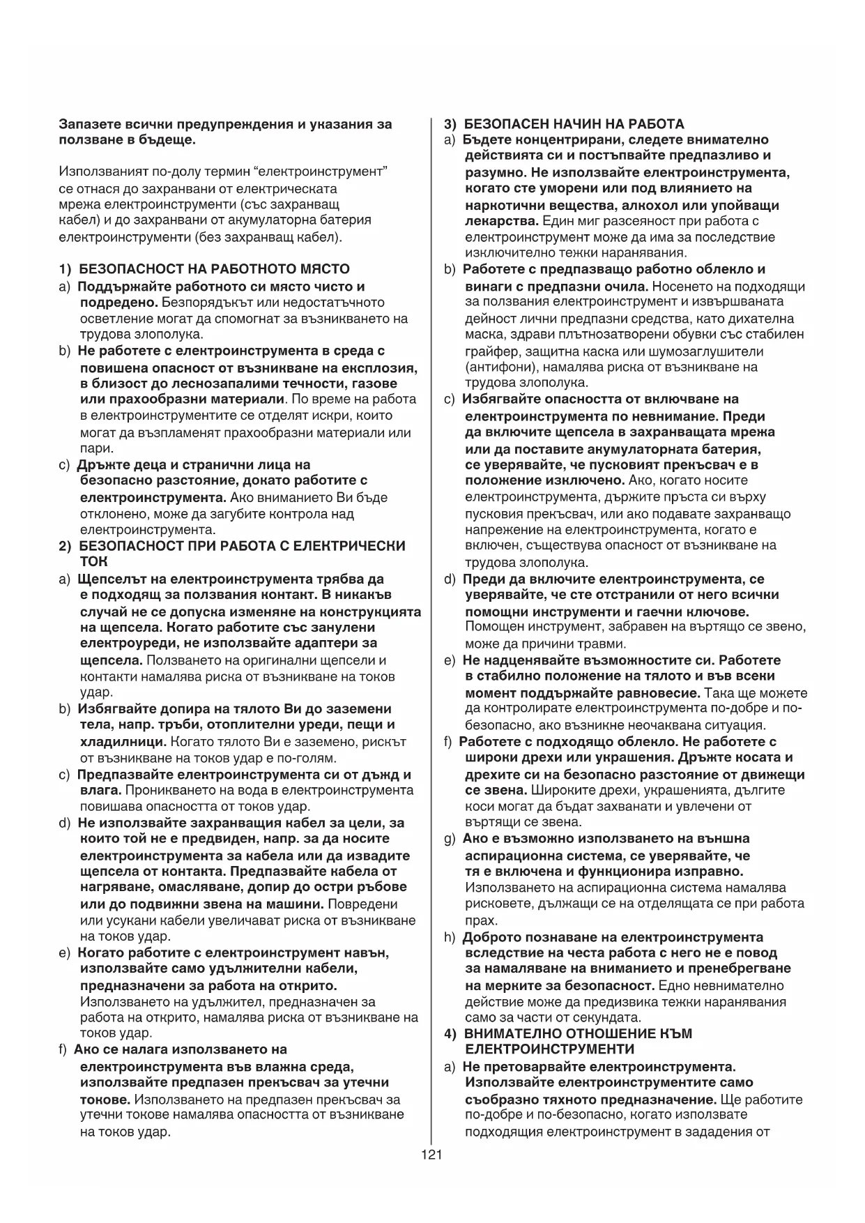АКУМУЛАТОРНИ ЕЛЕКТРОИНСТРУМЕНТИ a) За зареждането на акумулаторните батерии използвайте само зарядните устройства, препоръчвани от производителя. Когато използвате зарядни устройства за зареждане на неподходящи акумулаторни батерии, съществува опасност от възникване на пожар. b) За захранване на електроинструментите използвайте само предвидените за съответния модел акумулаторни батерии. Използването на различни акумулаторни батерии може да предизвика трудова злополука и/или пожар. c) Предпазвайте неизползваните акумулаторни батерии от контакт с големи или малки метални123 в резултат на силното ускорение да отлетят надалече и да предизвикат наранявания също и извън зоната