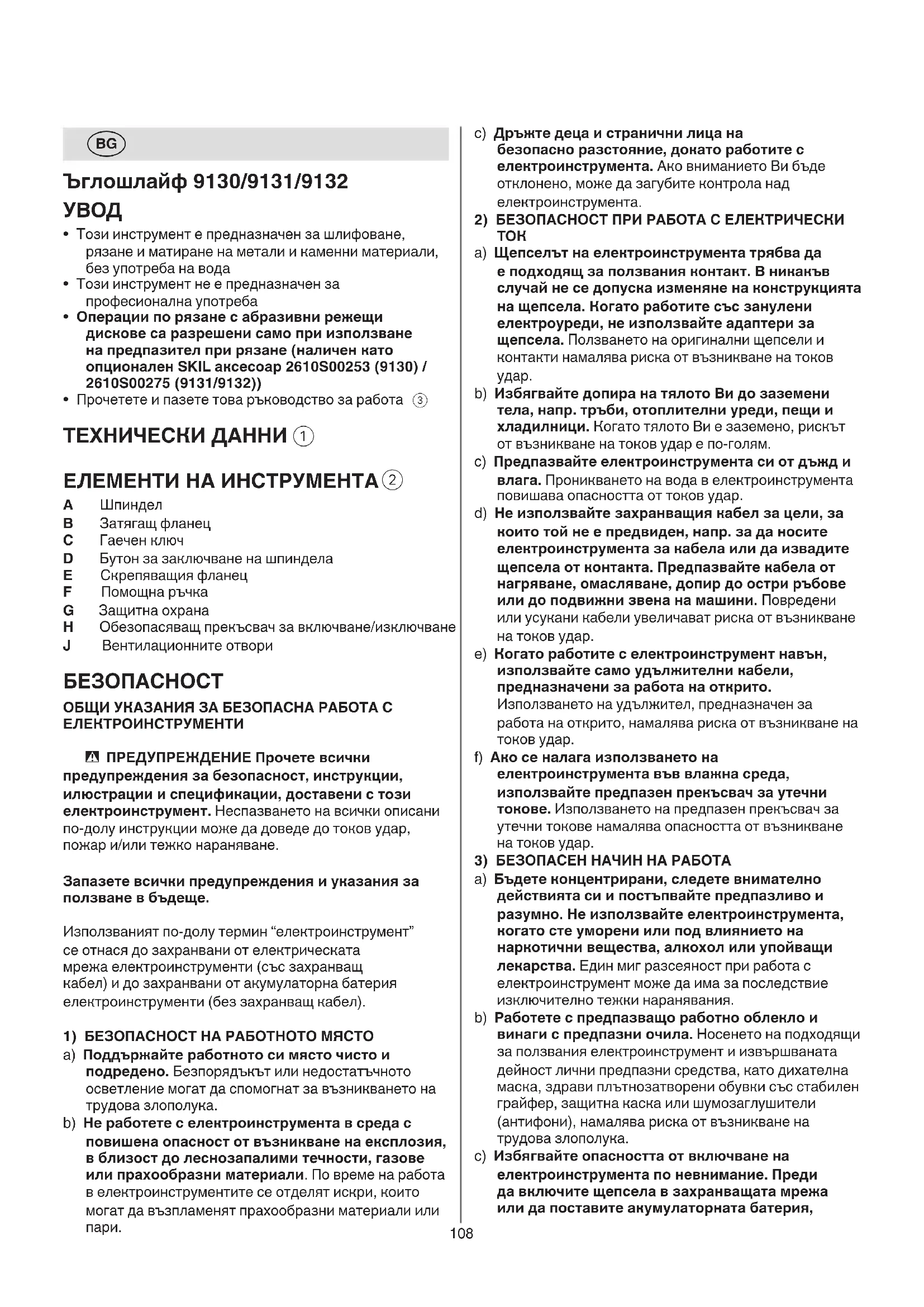- Операции по рязане с абразивни режещи дискове са разрешени само при използване на предпазител при рязане (наличен като опционален SKIL аксесоар 2610S00253 (9130) / 2610S00275 (9131/9132))