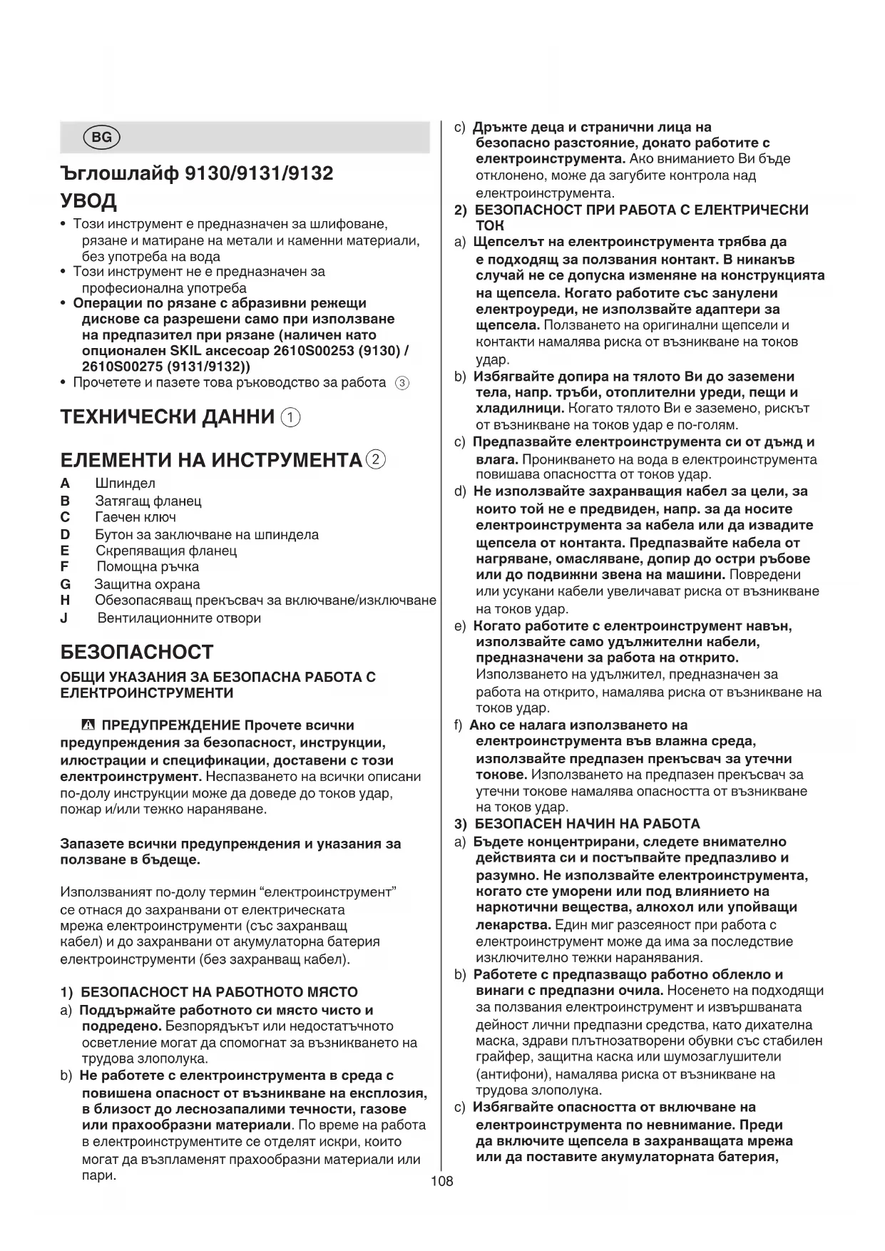 A Шпиндел B Затягащ фланец C Гаечен ключ D Бутон за заключване на шпиндела E Скрепяващия фланец F Помощна ръчка G Защитна охрана H Обезопасяващ прекъсвач за включване/изключване J Вентилационните отвоpи БЕЗОПАСНОСТ ОБЩИ УКАЗАНИЯ ЗА БЕЗОПАСНА РАБОТА С ЕЛЕКТРОИНСТРУМЕНТИ - ПРЕДУПРЕЖДЕНИЕ Прочете всички предупреждения за безопасност, инструкции, илюстрации и спецификации, доставени с този електроинструмент. Неспазването на всички описани по-долу инструкции може да доведе до токов удар, пожар и/или тежко нараняване. Запазете всички предупреждения и указания за ползване в бъдеще. Използваният по-долу термин “електроинструмент” се отнася до захранвани от електрическата мрежа електроинструменти (със захранващ кабел) и до захранвани от акумулаторна батерия електроинструменти (без захранващ кабел).