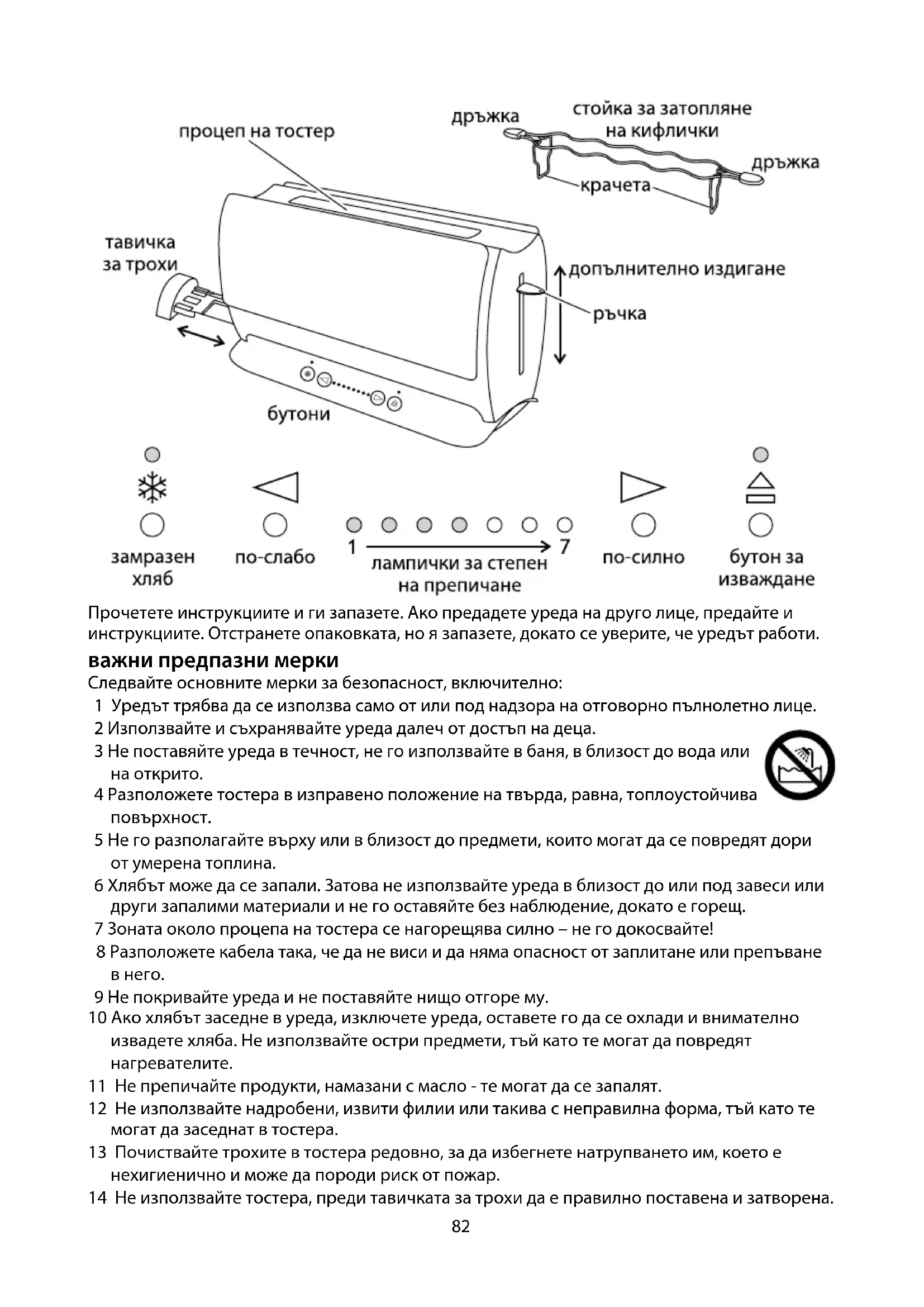 9 Не покривайте уреда и не поставяйте нищо отгоре му. 10 Ако хлябът заседне в уреда, изключете уреда, оставете го да се охлади и внимателно извадете хляба. Не използвайте остри предмети, тъй като те могат да повредят нагревателите. 11 Не препичайте продукти, намазани с масло - те могат да се запалят. 12 Не използвайте надробени, извити филии или такива с неправилна форма, тъй като те могат да заседнат в тостера. 13 Почиствайте трохите в тостера редовно, за да избегнете натрупването им, което е нехигиенично и може да породи риск от пожар. 14 Не използвайте тостера, преди тавичката за трохи да е правилно поставена и затворена.83 15 Изключете уреда от контакта, когато не го използвате, преди да го преместите, както и преди почистване. 16 Дръжте уреда и кабела на разстояние от котлони, готварски плочи или печки. 17 Не използвайте уреда за други цели, освен тези, описани в настоящите инструкции. 18 Този уред не трябва да се използва с външен таймер или система за дистанционно управление. 19 Не използвайте уреда, ако е повреден или не работи изрядно. 20 Ако кабелът е повреден, той трябва да се подмени от производителя, негов представител за сервизно обслужване или друго квалифицирано за тази цел лице, за да се избегне всякакъв риск. само за домашна употреба сензорни бутони