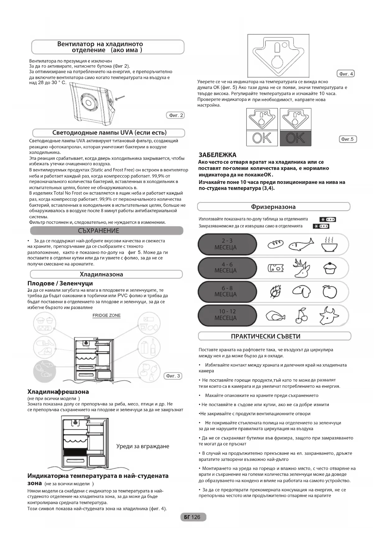 - За да се предотврати прекомерната консумация на енергия, не се препоръчва честото или продължително отваряне на вратитеУверете се че на индикатора на температурата се вижда ясно думата ОК (фиг. 5) Ако тази дума не се появи, значи температурата е твърде висока. Регулирайте температурата и изчакайте 10 часа. Проверете индикатора ипри необходимост, направте нованастройка. БГ 126 Фиг. 2ВентилатораСветодиодные лампы UVA активируют титановый фильтр, создающий реакцию «фотокапрола», которая уничтожит бактерии в воздухе холодильника.Эта реакция срабатывает, когда дверь холодильника закрывается, чтобы избежать утечки очищенного воздуха.В вентилируемых продуктах (Static and Frost Free) он встроен в вентилятор неба и работает каждый раз, когда компрессор работает. 99,9% от первоначального количества бактерий, вставленных в холодильник в испытательных целях, более не обнаруживалось в.В изделиях Total No Frost он вставляется в ящик неба и работает каждый раз, когда компрессор работает. 99,9% от первоначального количества бактерий, вставленных в холодильник в испытательных целях, больше не обнаруживалось в воздухе после 8 минут работы антибактериальной системы.Фильтр постоянен и, следовательно, не нуждается в изменении.по презумция е изключен За да го активирате, натиснете бутона (Фиг 2). За оптимизиране на потреблението на енергия, е препоръчителнода включите вентилатора само когато температурата на въздуха енад 28 до 30 ° C. Вентилатор на хладилното отделение (ако има ) Изчакайте поне 10 часа преди позициониране на нива на по-студена температура (3,4). Фиг. 4 Светодиодные лампы UVA (если есть)Размразяване на хладилното отделение ЗАМРАЗЯВАНЕ РАЗМРАЗЯВАНЕ