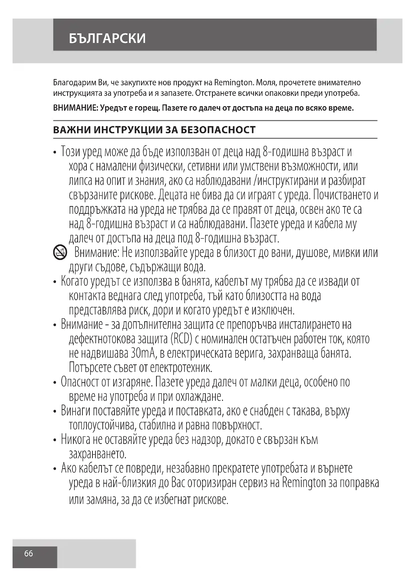 - Ако кабелът се повреди, незабавно прекратете употребата и върнете уреда в най-близкия до Вас оторизиран сервиз на Remington за поправка или замяна, за да се избегнат рискове. БЪЛГАРСКИ67
