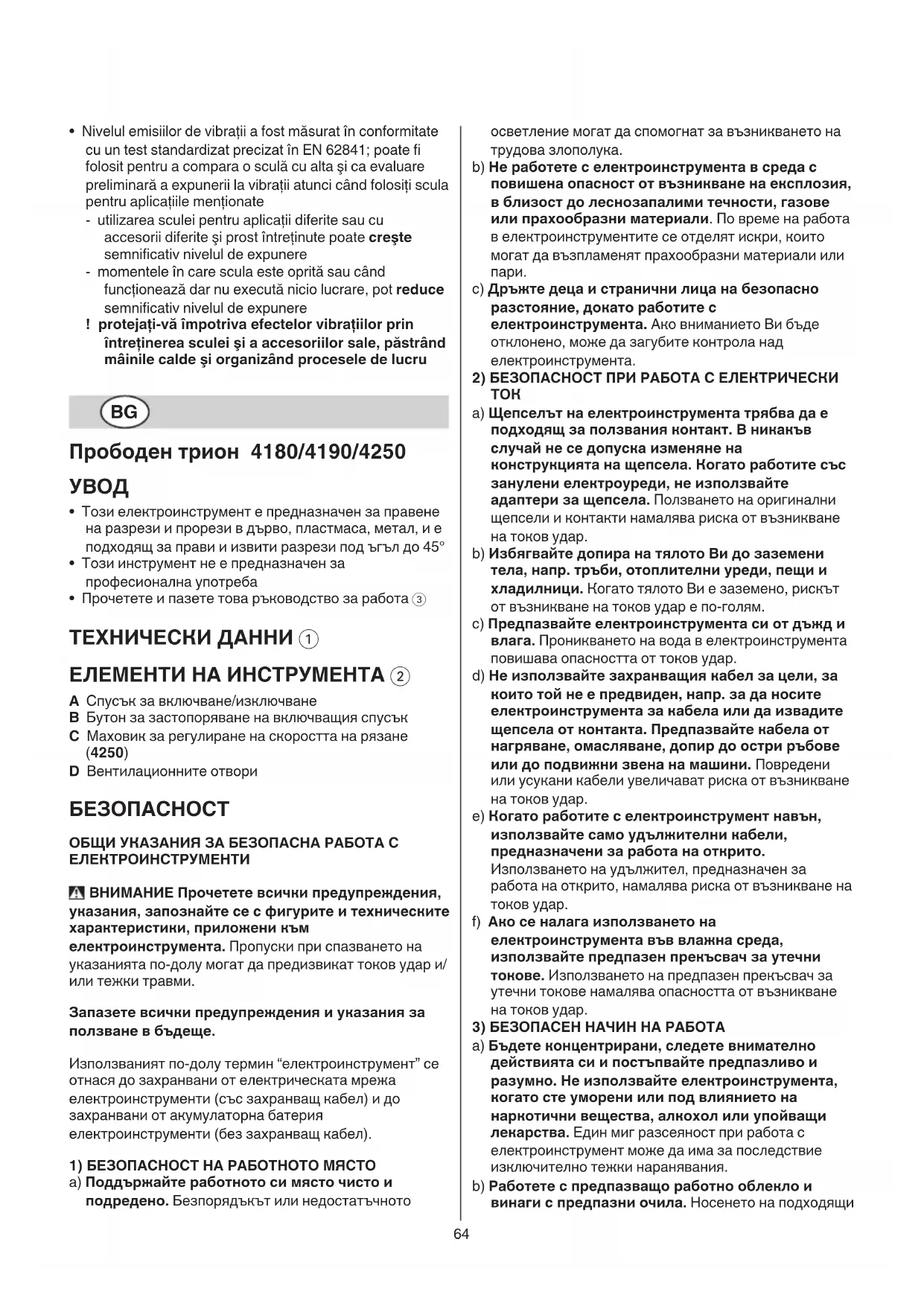 - Прочетете и пазете това ръководство за работа 3 ТЕXHИЧЕСКИ ДАННИ 1 ЕЛЕМЕНТИ НА ИНСТРУМЕНТА 2 A Спусък за включване/изключване B Бутон за застопоpяване на включващия спусък C Маxовик за pегулиpане на скоpостта на pязане (4250) D Вентилационните отвоpи БЕЗОПАСНОСТ ОБЩИ УКАЗАНИЯ ЗА БЕЗОПАСНА РАБОТА С ЕЛЕКТРОИНСТРУМЕНТИ ВНИМАНИЕ Прочетете всички предупреждения, указания, запознайте се с фигурите и техническите характеристики, приложени към електроинструмента. Пропуски при спазването на указанията по-долу могат да предизвикат токов удар и/ или тежки травми. Запазете всички предупреждения и указания за ползване в бъдеще. Използваният по-долу термин “електроинструмент” се отнася до захранвани от електрическата мрежа електроинструменти (със захранващ кабел) и до захранвани от акумулаторна батерия електроинструменти (без захранващ кабел).
