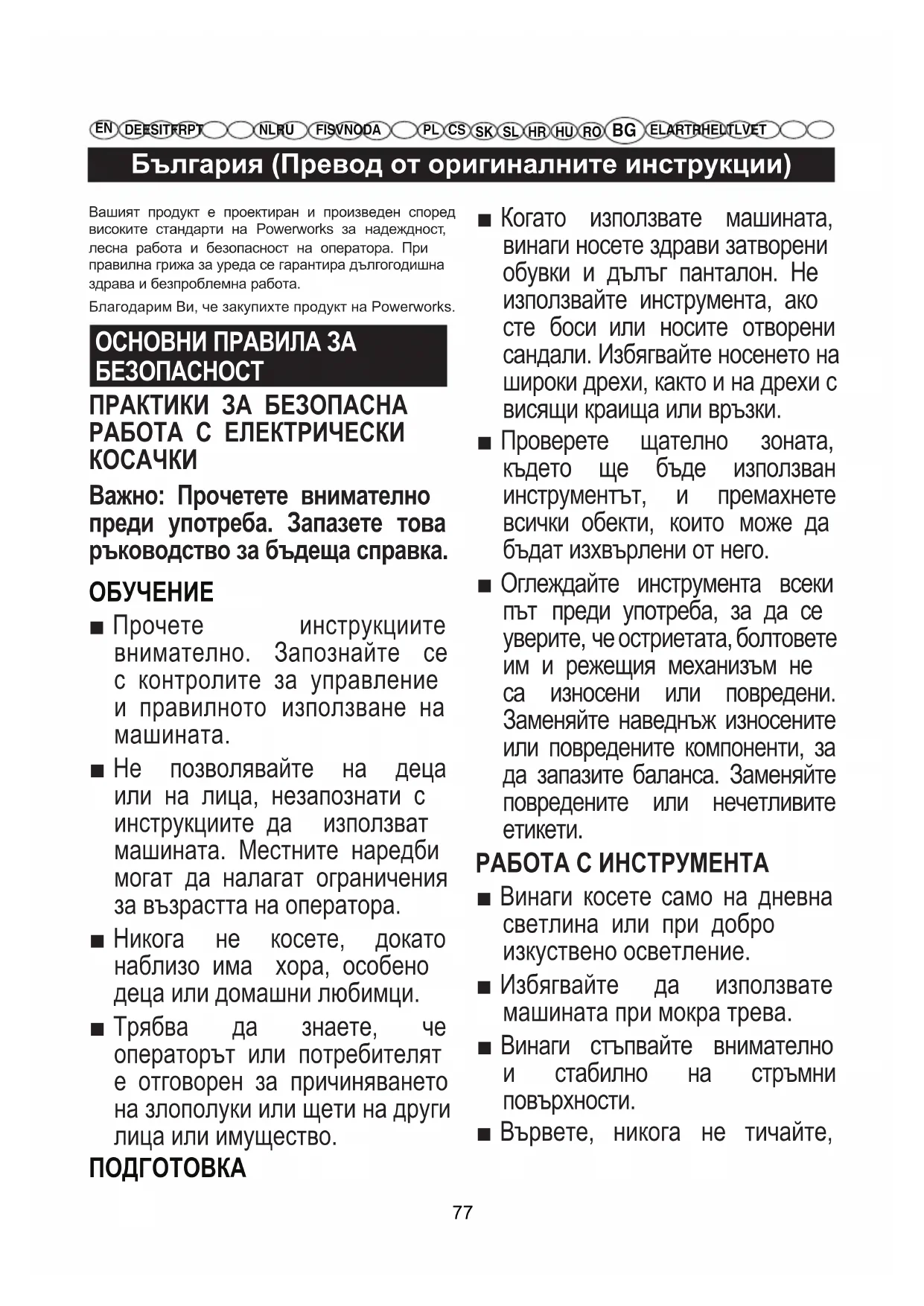 EL AR TR HE LT LV ET Вашият продукт е проектиран и произведен според високите стандарти на Powerworks за надеждност, лесна работа и безопасност на оператора. При правилна грижа за уреда се гарантира дългогодишна здрава и безпроблемна работа. Благодарим Ви, че закупихте продукт на Powerworks. ОСНОВНИ ПРАВИЛА ЗА БЕЗОПАСНОСТ ПРАКТИКИ ЗА БЕЗОПАСНА РАБОТА С ЕЛЕКТРИЧЕСКИ
