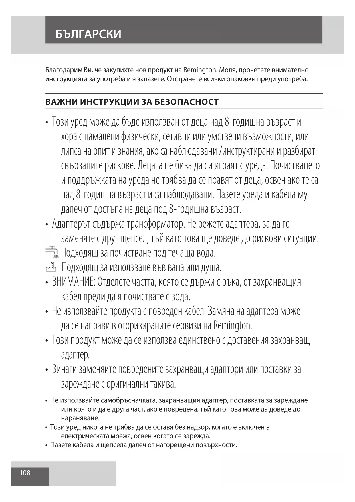 - Адаптерът съдържа трансформатор. Не режете адаптера, за да го заменяте с друг щепсел, тъй като това ще доведе до рискови ситуации. Подходящ за почистване под течаща вода. E Подходящ за използване във вана или душа.