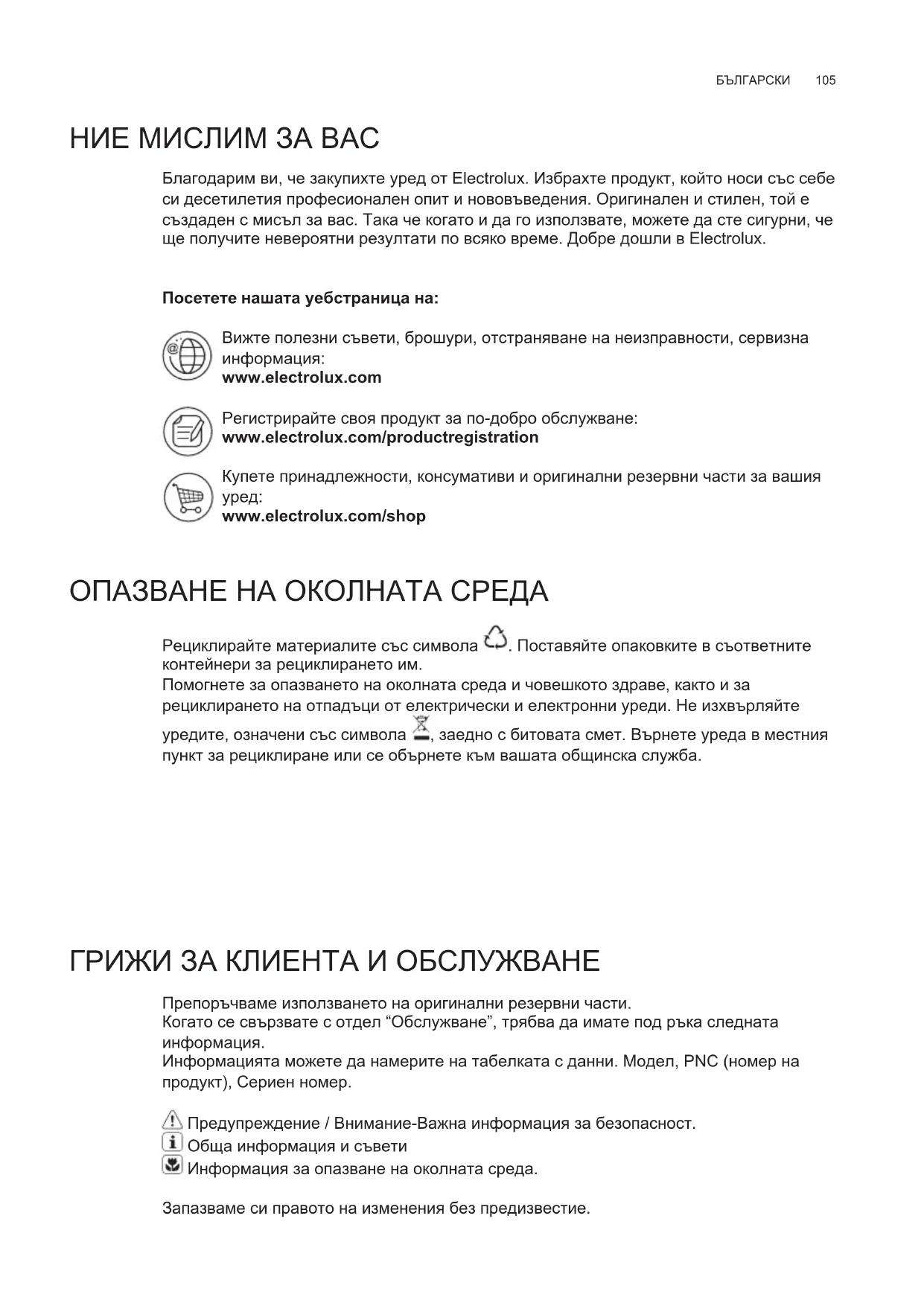 НИЕ МИСЛИМ ЗА ВАС Благодарим ви, че закупихте уред от Electrolux. Избрахте продукт, който носи със себе си десетилетия професионален опит и нововъведения. Оригинален и стилен, той е създаден с мисъл за вас. Така че когато и да го използвате, можете да сте сигурни, че ще получите невероятни резултати по всяко време. Добре дошли в Electrolux.