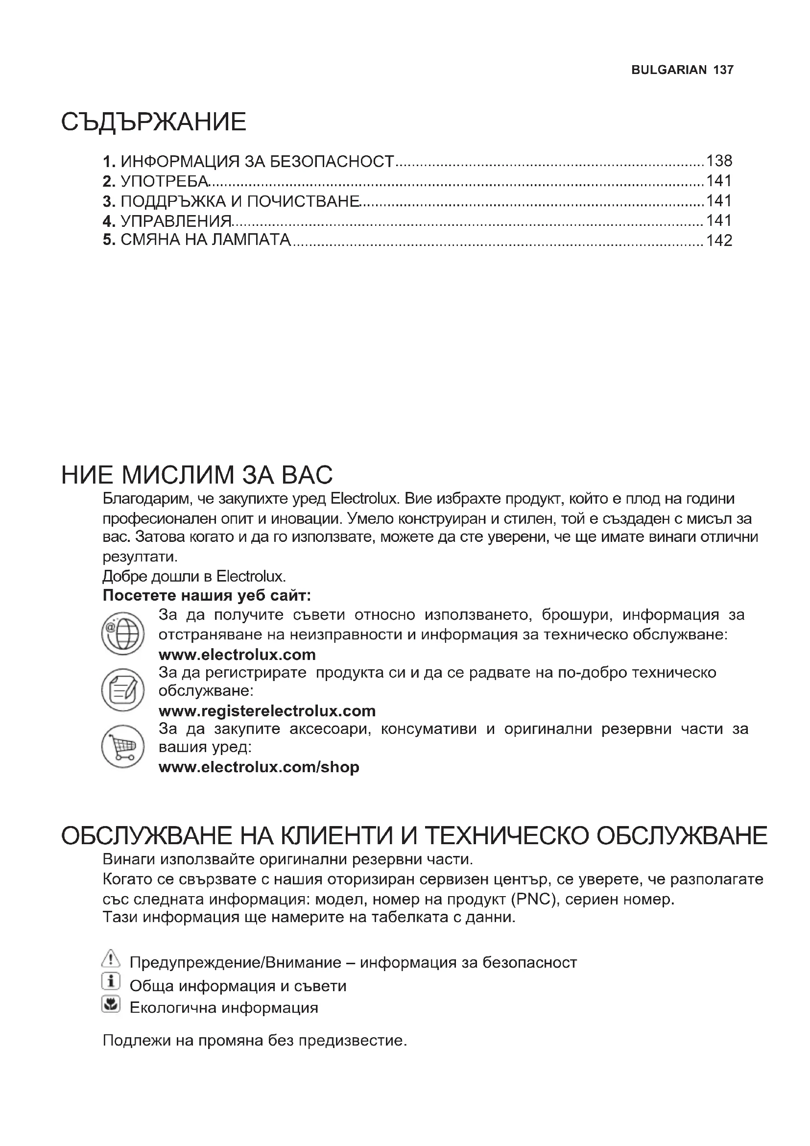 Добре дошли в Electrolux. Посетете нашия уеб сайт: За да получите съвети относно използването, брошури, информация за отстраняване на неизправности и информация за техническо обслужване: www.electrolux.com За да регистрирате продукта си и да се радвате на по-добро техническо обслужване: www.registerelectrolux.com За да закупите аксесоари, консумативи и оригинални резервни части за вашия уред: www.electrolux.com/shop ОБСЛУЖВАНЕ НА КЛИЕНТИ И ТЕХНИЧЕСКО ОБСЛУЖВАНЕ Винаги използвайте оригинални резервни части. Когато се свързвате с нашия оторизиран сервизен център, се уверете, че разполагате със следната информация: модел, номер на продукт (PNC), сериен номер. Тази информация ще намерите на табелката с данни. Предупреждение/Внимание – информация за безопасност Обща информация и съвети Екологична информация Подлежи на промяна без предизвестие.138 www.electrolux.com