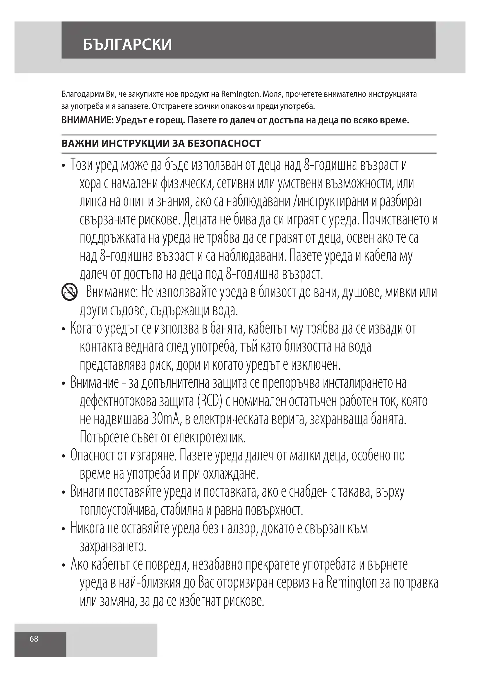 AE68 Благодарим Ви, че закупихте нов продукт на Remington. Моля, прочетете внимателно инструкцията за употреба и я запазете. Отстранете всички опаковки преди употреба. ВНИМАНИЕ: Уредът е горещ. Пазете го далеч от достъпа на деца по всяко време. ВАЖНИ ИНСТРУКЦИИ ЗА БЕЗОПАСНОСТ