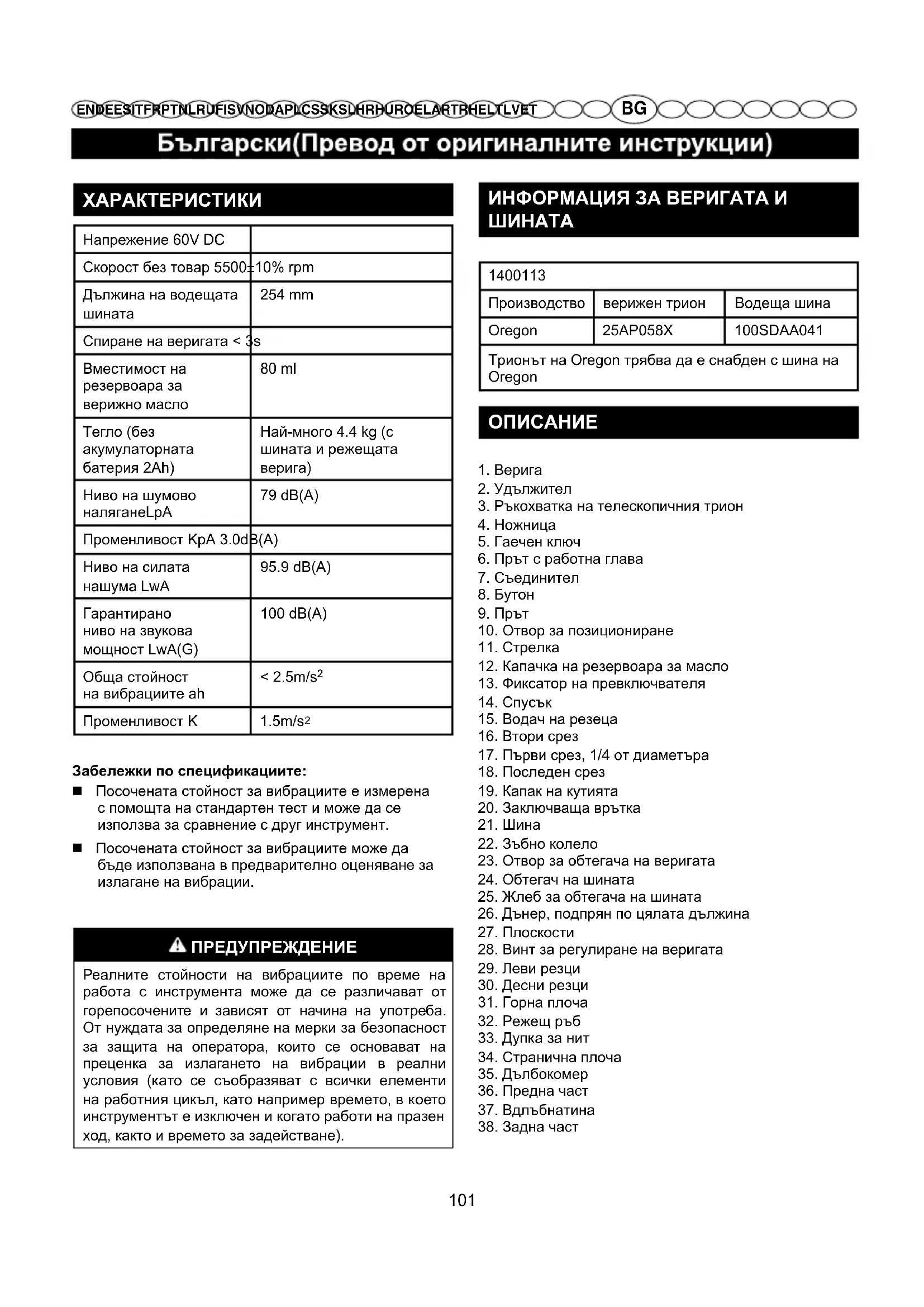 Забележки по спецификациите: Посочената стойност за вибрациите е измерена с помощта на стандартен тест и може да се използва за сравнение с друг инструмент. Посочената стойност за вибрациите може да бъде използвана в предварително оценяване за излагане на вибрации. ПРЕДУПРЕЖДЕНИЕ Реалните стойности на вибрациите по време на работа с инструмента може да се различават от горепосочените и зависят от начина на употреба. От нуждата за определяне на мерки за безопасност за защита на оператора, които се основават на преценка за излагането на вибрации в реални условия (като се съобразяват с всички елементи на работния цикъл, като например времето, в което инструментът е изключен и когато работи на празен ход, както и времето за задействане). ИНФОРМАЦИЯ ЗА ВЕРИГАТА И