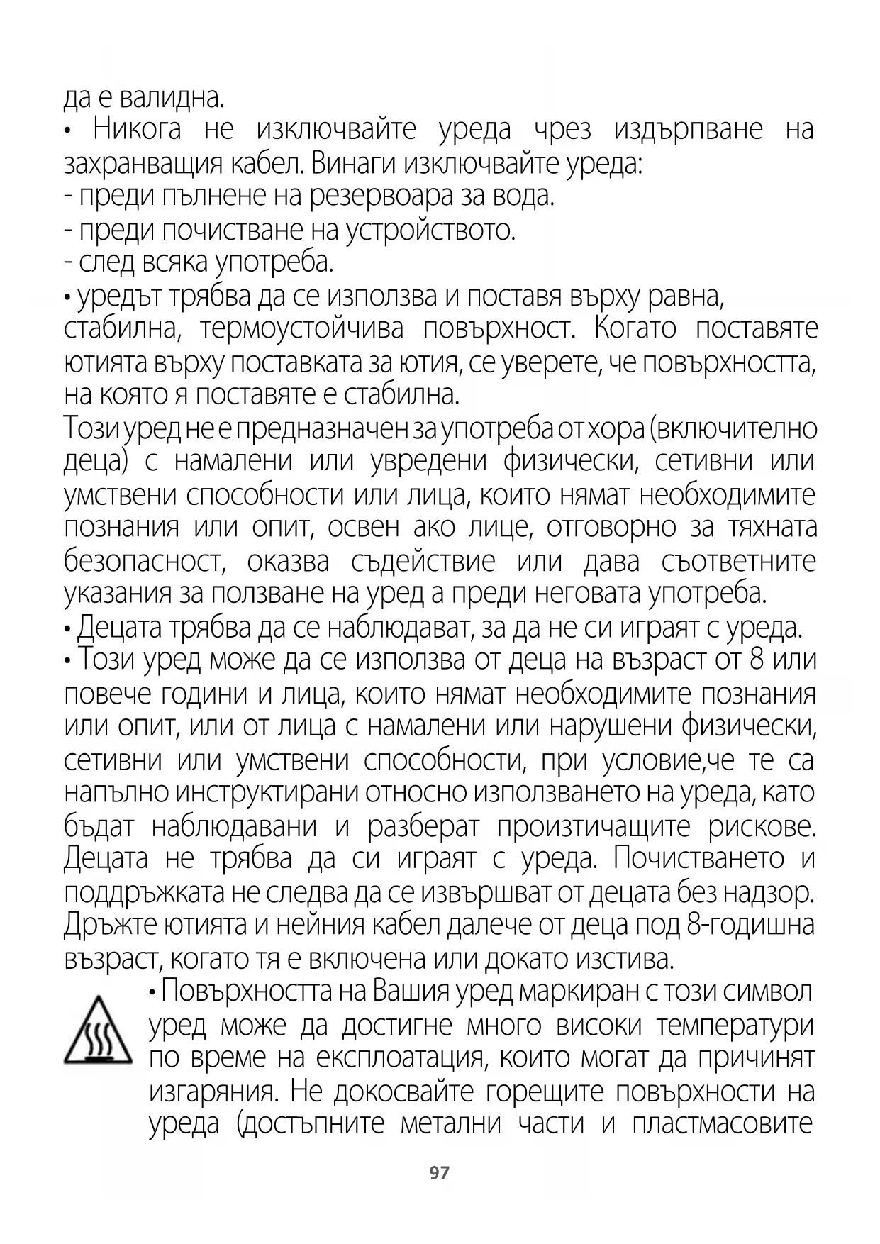 - Повърхността на Вашия уред маркиран с този символ уред може да достигне много високи температури по време на експлоатация, които могат да причинят изгаряния. Не докосвайте горещите повърхности на уреда (достъпните метални части и пластмасовите98 части, прилежащи към металните части) докато уредът не изстине напълно.