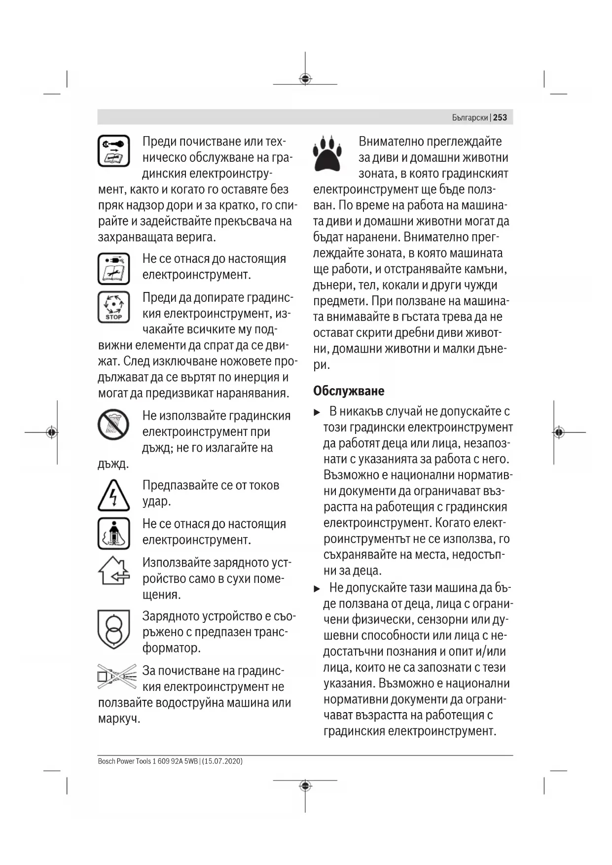 Предупреждение: Когато градинският електроинстру- мент работи, стойте на безо- пасно разстояние от него. Внимание: Не допирайте въртящите се ножове. Но- жовете са остри. Съществу- ва опасност да Ви бъде отрязан пръст на краката или ръцете. 1 609 92A 5WB | (15.07.2020) Bosch Power ToolsБългарски | 253 Преди почистване или тех- ническо обслужване на гра- динския електроинстру- мент, както и когато го оставяте без пряк надзор дори и за кратко, го спи- райте и задействайте прекъсвача на захранващата верига. Не се отнася до настоящия електроинструмент. Преди да допирате градинс- кия електроинструмент, из- чакайте всичките му под- вижни елементи да спрат да се дви- жат. След изключване ножовете про- дължават да се въртят по инерция и могат да предизвикат наранявания. Не използвайте градинския електроинструмент при дъжд; не го излагайте на