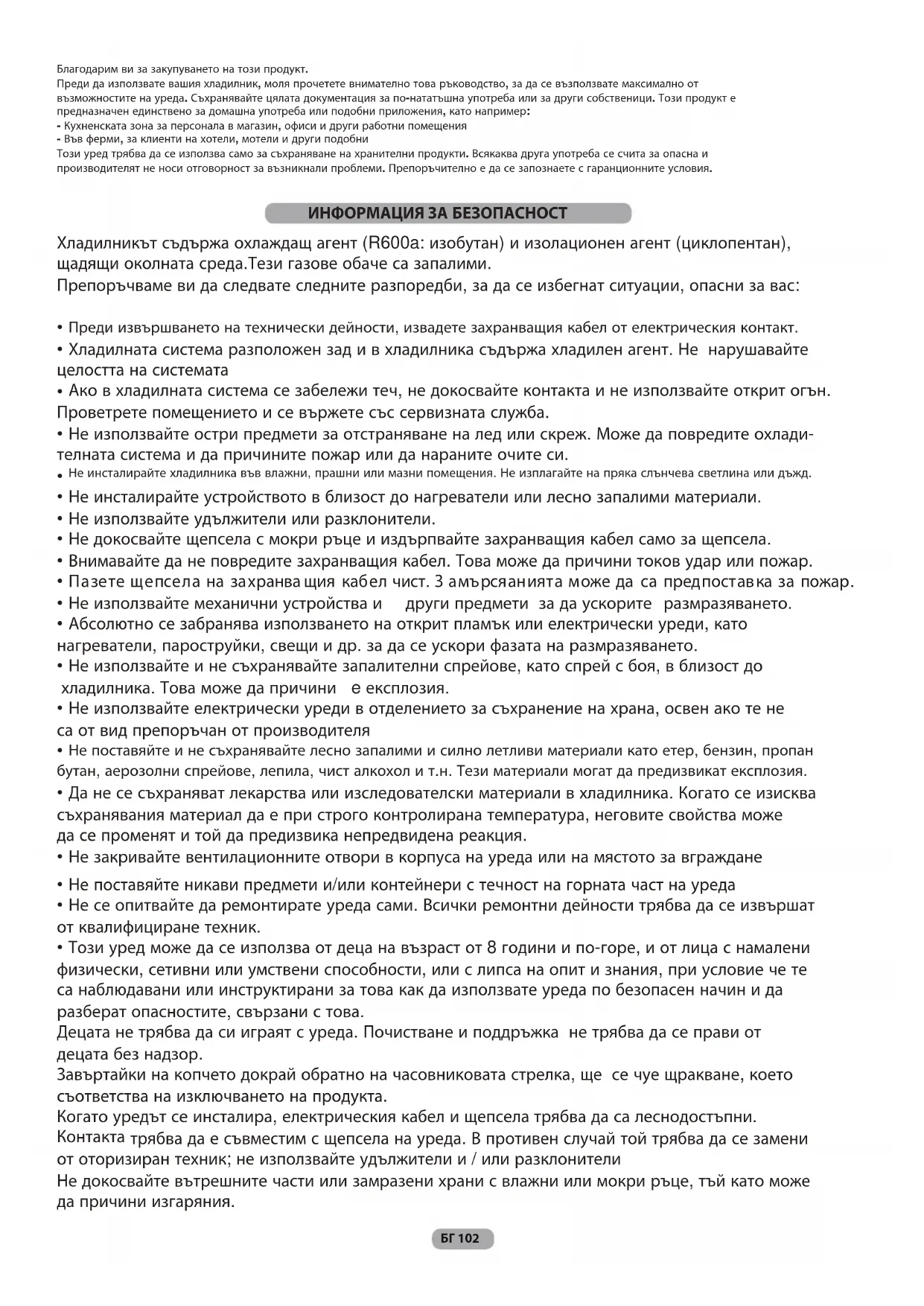 трябва да е съвместим с щепсела на уреда. В противен случай той трябва да се замени от оторизиран техник; не използвайте удължители и / или разклонители Не докосвайте вътрешните части или замразени храни с влажни или мокри ръце, тъй като може да причини изгаряния. ИНФОРМАЦИЯ ЗА БЕЗОПАСНОСТ БГ 102• Контактът е правилно заземен.