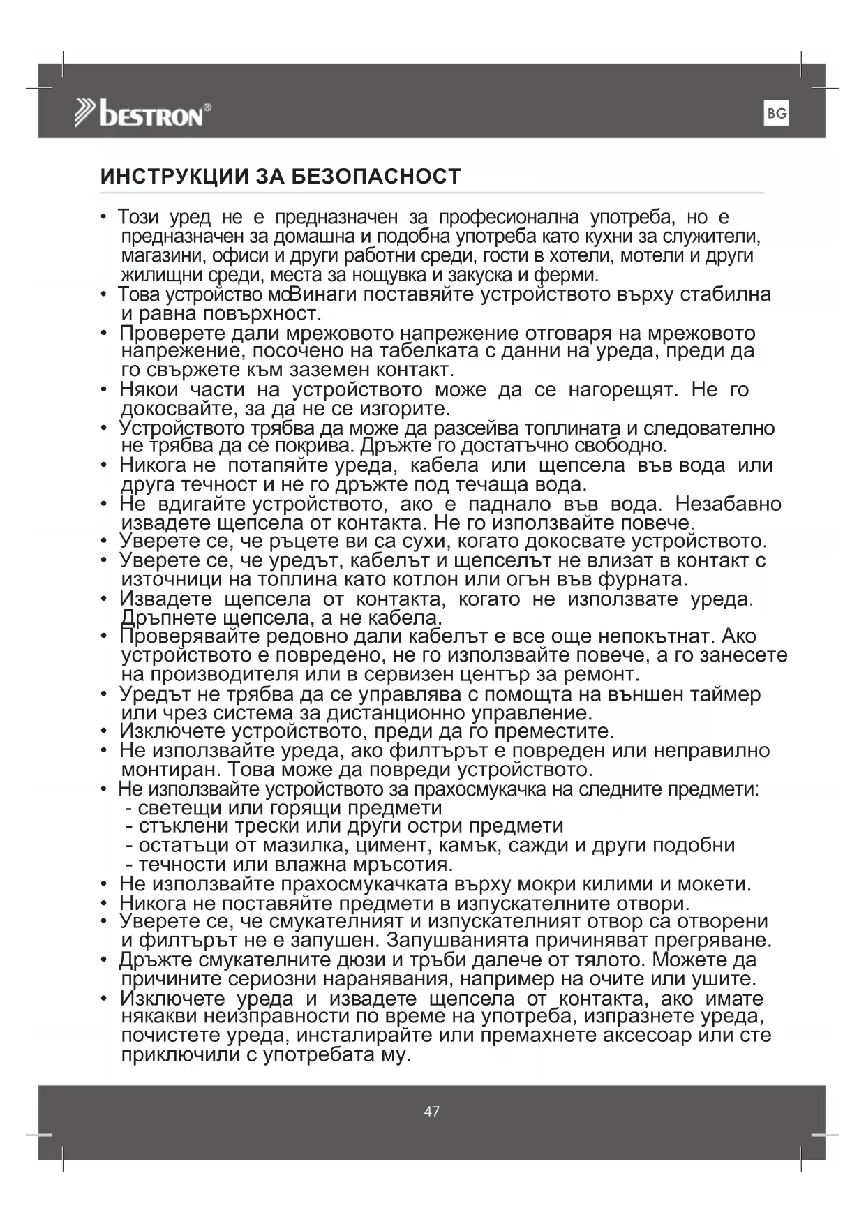 В малко вероятния случай на повреда, свържете се с отдела за обслужване на клиенти на Bestron: www.bestron.com/service Технически спецификации Модел ABL930SR Напрежение (V) 220-240 Честота (Hz) 50/60 Клас на безопасност 2 Мощност (ват) 700 Ниво на шум (dB(A)) - Макс. Капацитет 1.5L Максимално време за непрекъсната употреба (KB)